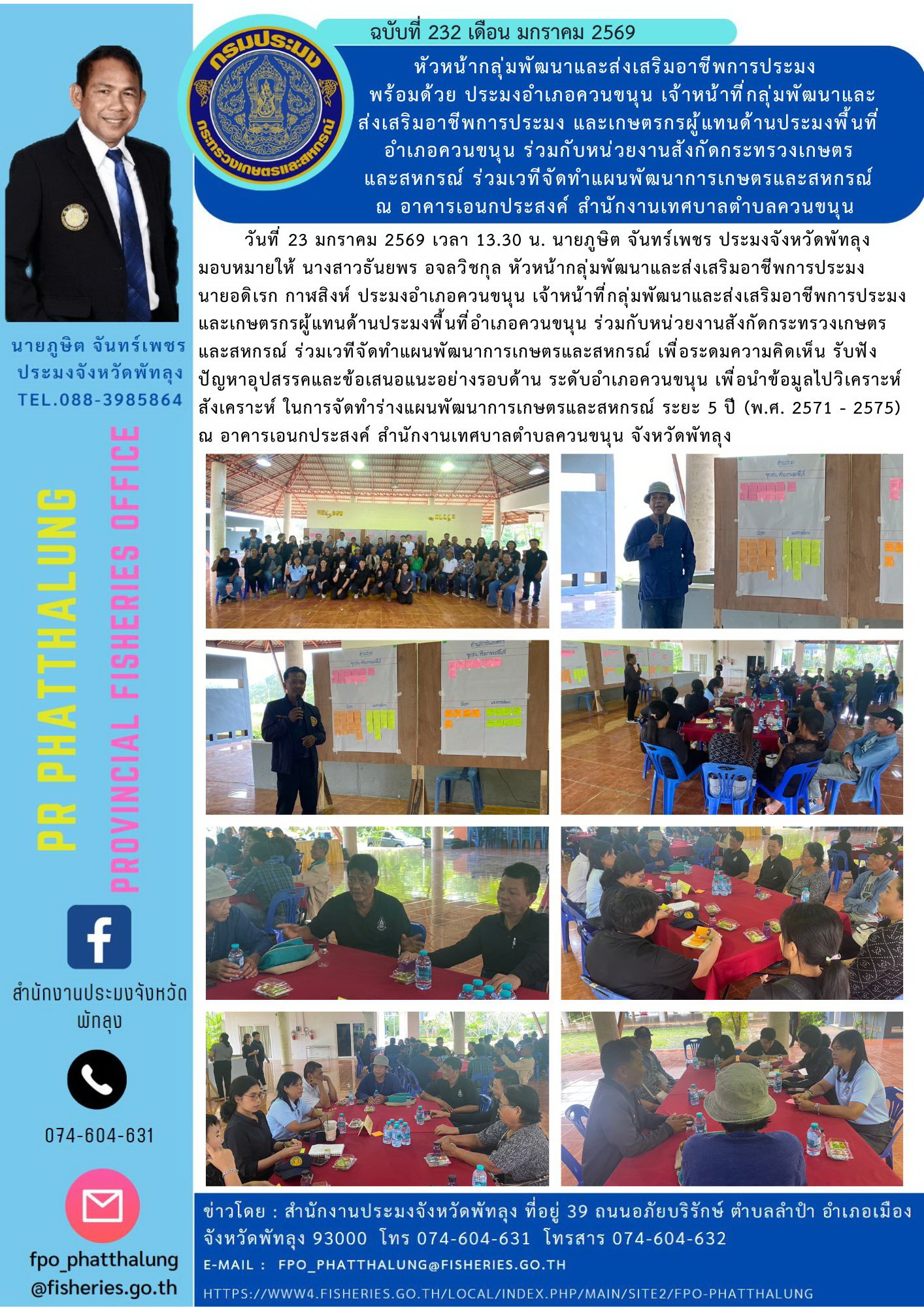 วันที่ 23 มกราคม 2569 เวลา 13.30 น. นายภูษิต จันทร์เพชร ประมงจังหวัดพัทลุง มอบหมายให้ นางสาวธันยพร อจลวิชกุล หัวหน้ากลุ่มพัฒนาและส่งเสริมอาชีพการประมง นายอดิเรก กาฬสิงห์ ประมงอำเภอควนขนุน เจ้าหน้าที่กลุ่มพัฒนาและส่งเสริมอาชีพการประมง และเกษตรกรผู้แทนด้านประมงพื้นที่อำเภอควนขนุน ร่วมกับหน่วยงานสังกัดกระทรวงเกษตรและสหกรณ์ ร่วมเวทีจัดทำแผนพัฒนาการเกษตรและสหกรณ์ เพื่อระดมความคิดเห็น รับฟังปัญหาอุปสรรคและข้อเสนอแนะอย่างรอบด้าน ระดับอำเภอควนขนุน เพื่อนำข้อมูลไปวิเคราะห์ สังเคราะห์ ในการจัดทำร่างแผนพัฒนาการเกษตรและสหกรณ์ ระยะ 5 ปี (พ.ศ. 2571 - 2575) ณ อาคารเอนกประสงค์ สำนักงานเทศบาลตำบลควนขนุน จังหวัดพัทลุง