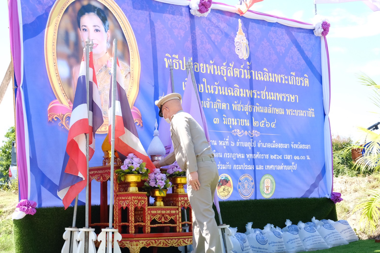 วันที่ 1 กรกฎาคม 2564 ณ บริเวณสระน้ำชลประทาน หมู่ที่ 6 ตำบลยุโป อำเภอเมืองยะลา จังหวัดยะลา นายชัยสิทธิ์ พาณิชพงศ์ ผู้ว่าราชการจังหวัดยะลา เป็นประธานในพิธีปล่อยพันธุ์สัตว์น้ำ เนื่องในวันเฉลิมพระชนมพรรษา สมเด็จพระนางเจ้าสุทิดา พัชรสุธาพิมลลักษณ พระบรมราชินี 3 มิถุนายน 2564 โดยมี นายสมปอง แสงทอง ประมงจังหวัดยะลา หัวหน้าส่วนราชการ ผู้นำท้องถิ่นและประชาชน เข้าร่วมตามมาตรการป้องกันการแพร่ระบาดโรคติดเชื้อไวรัสโคโรน่า 2019 อย่างเคร่งครัด