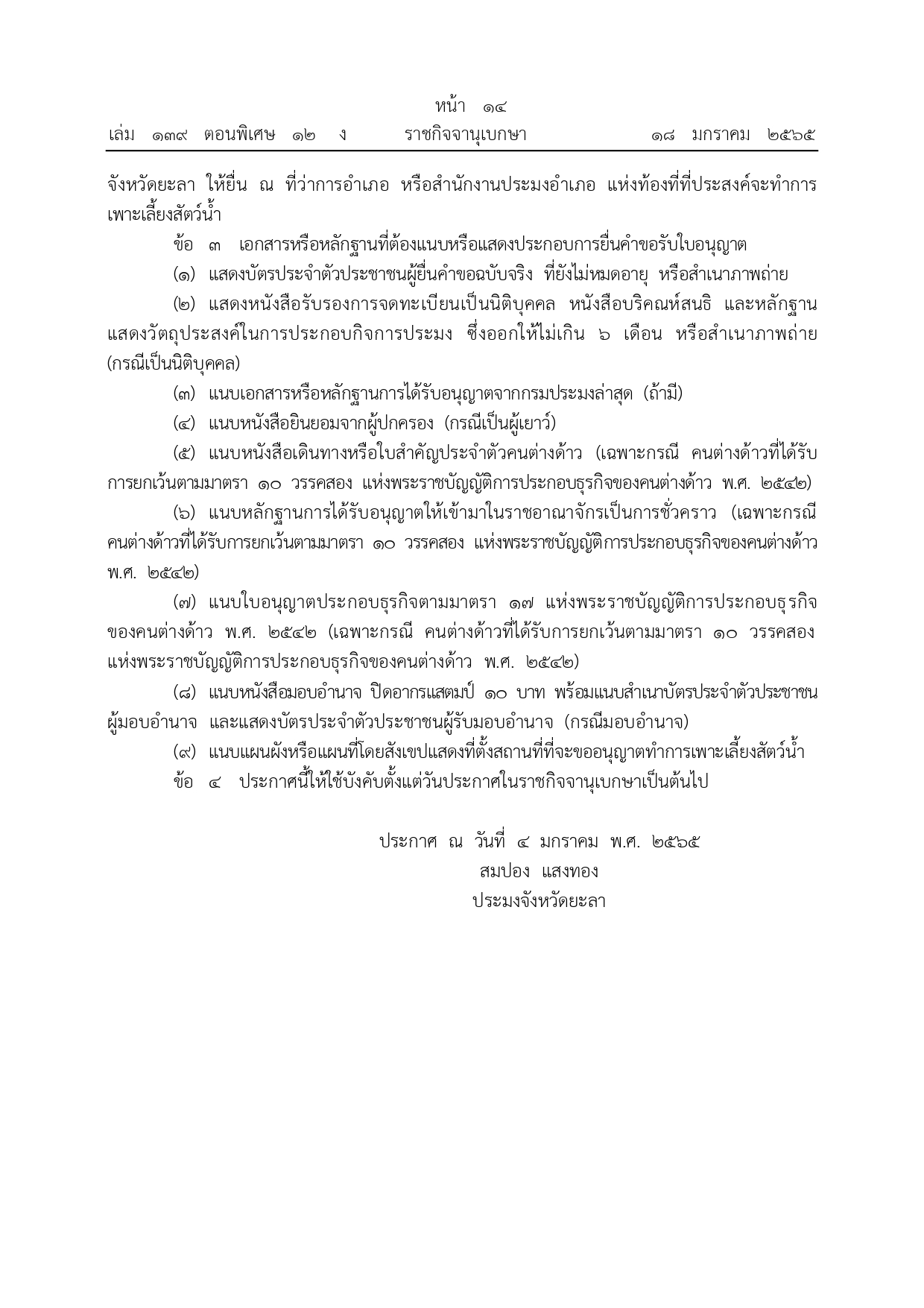 3. เป็นผู้ประสงค์จะทำการเพาะเลี้ยงสัตว์น้ำในกระชัง ในพื้นที่ตาม ประกาศคณะกรรมการประมงประจำจังหวัดยะลา เรื่อง กำหนดเขตเพาะเลี้ยงสัตว์น้ำสำหรับกิจการการเพาะเลี้ยงสัตว์น้ำควบคุม ประเภท การเพาะเลี้ยงสัตว์น้ำในกระชัง (ฉบับที่ 3) พ.ศ. 2564 ลงวันที่ 20 สิงหาคม 2564
