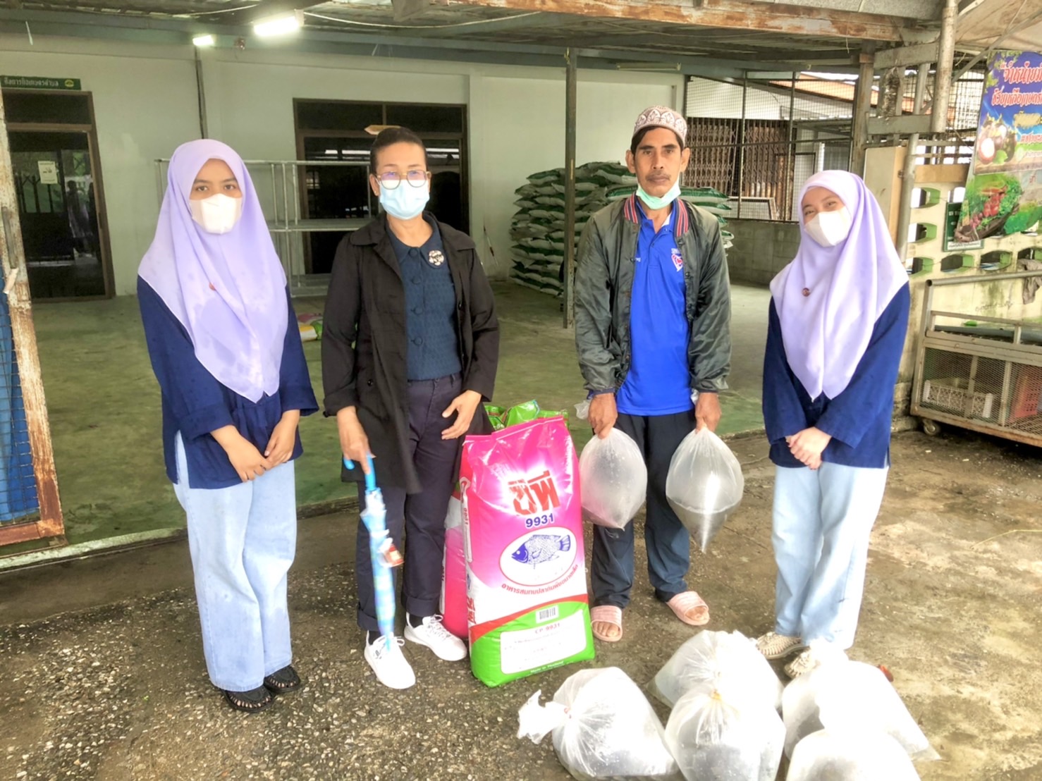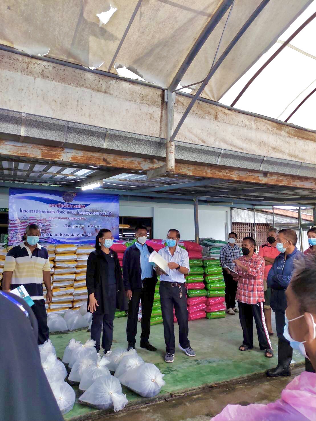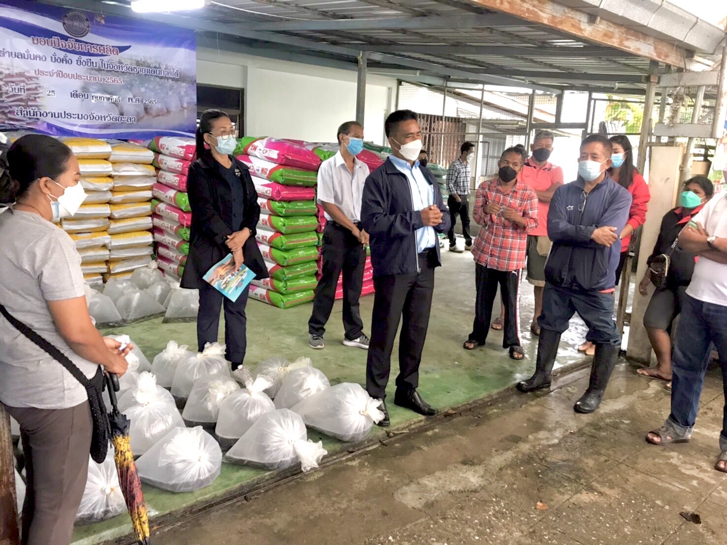 วันที่ 25 กุมภาพันธ์ 2565 นายสมปอง แสงทอง ประมงจังหวัดยะลา พร้อมด้วยหัวหน้ากลุ่มพัฒนาและส่งเสริมอาชีพการประมง ประมงอำเภอเมืองยะลา และเจ้าหน้าที่สำนักงานประมงจังหวัดยะลา มอบปัจจัยการผลิตโครงการตำบล มั่นคง มั่งคั่ง ยั่งยืน ในจังหวัดชายแดนภาคใต้ ประจำปีงบประมาณ 2565 ให้กับเกษตรกรที่สนใจการเลี้ยงสัตว์น้ำจืด ในเขตพื้นที่อำเภอเมืองยะลา จำนวน 69 ราย ณ บริเวณตลาดสินค้าการเกษตรจังหวัดยะลา
