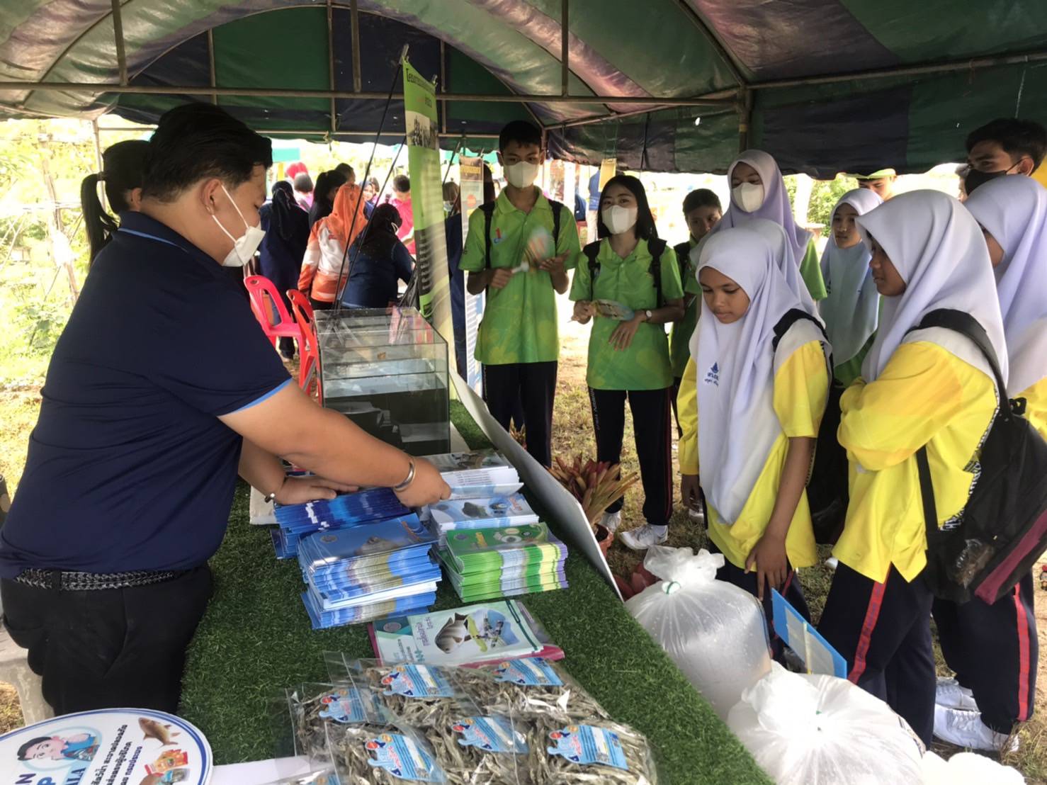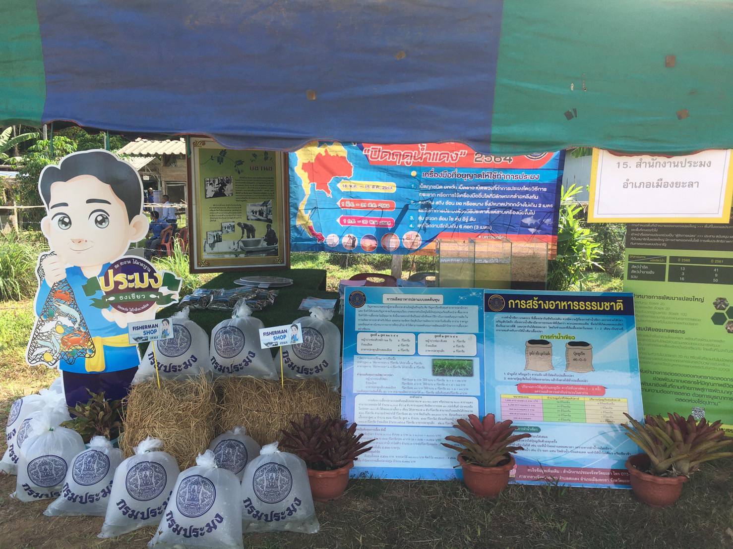 วัันที่ 24 พฤศจิกายน 2565 นายวริทธิ์ธร จันทนะ หัวหน้ากลุ่มพัฒนาเเละส่งเสริมอาชีพการประมง รักษาราชการเเทน ประมงจังหวัดยะลา มอบหมายให้เจ้าหน้าที่กลุ่มพัฒนาเเละส่งเสริมอาชีพการประมง เข้าร่วมจัดนิทรรศการ การสร้างอาหารธรรมชาติในบ่อดินเพื่อเลี้ยงสัตว์น้ำ (ปลากินพืช) ภายใต้โครงการศูนย์เรียนรู้การเพิ่มประสิทธิภาพการผลิตสินค้าเกษตร กิจกรรมวันถ่ายทอดเทคโนโลยีเพื่อเริ่มต้นฤดูการผลิตใหม่ (Field Day ) พร้อมให้ความรู้ทางด้านวิชาการ เเละสนับสนุนพันธุ์ปลากินพืช (ปลาตะเพียนขาว) จำนวน 10,000 ตัว พร้อมออกร้านจำหน่ายสินค้าแปรรูปสัตว์น้ำ ภายใต้โครงการการกระจายสินค้าประมง Fisherman shop เพื่อเป็นการประชาสัมพันธ์ เเละเพิ่มช่องทางการจำหน่ายสินค้าประมงแปรรูปอีกทางหนึ่ง ยอดจำหน่ายสินค้าวันนี้ จำนวน 4,200 บาท