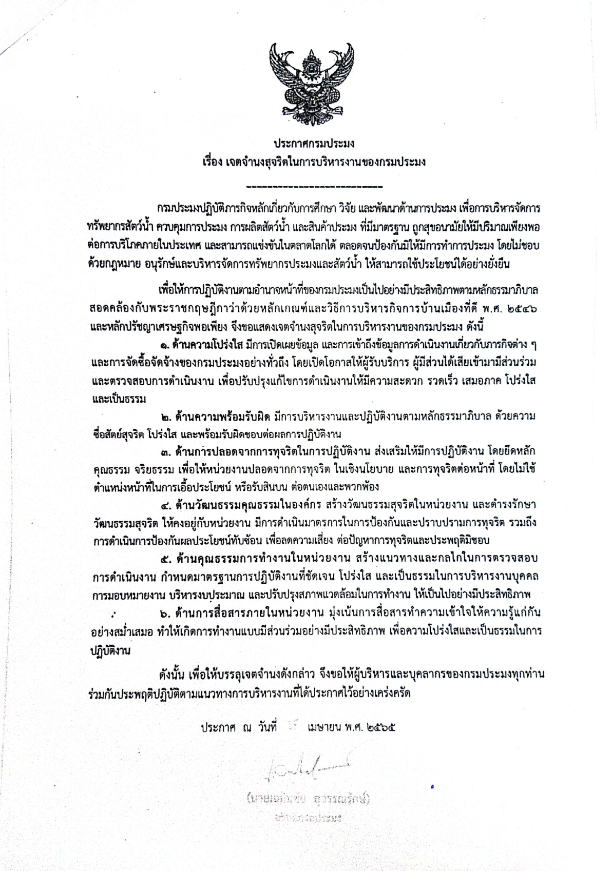 ประกาศกรมประมง เรื่อง เจตจำนงสุจริตในการบริหารงานของกรมประมง และเรื่องนโยบายไม่รับของขวัญและของกำนัลจากการปฏิบัติหน้าที่โดยกรมประมงได้ตระหนักต่อปัญหาการทุจริตประพฤติมิชอบ