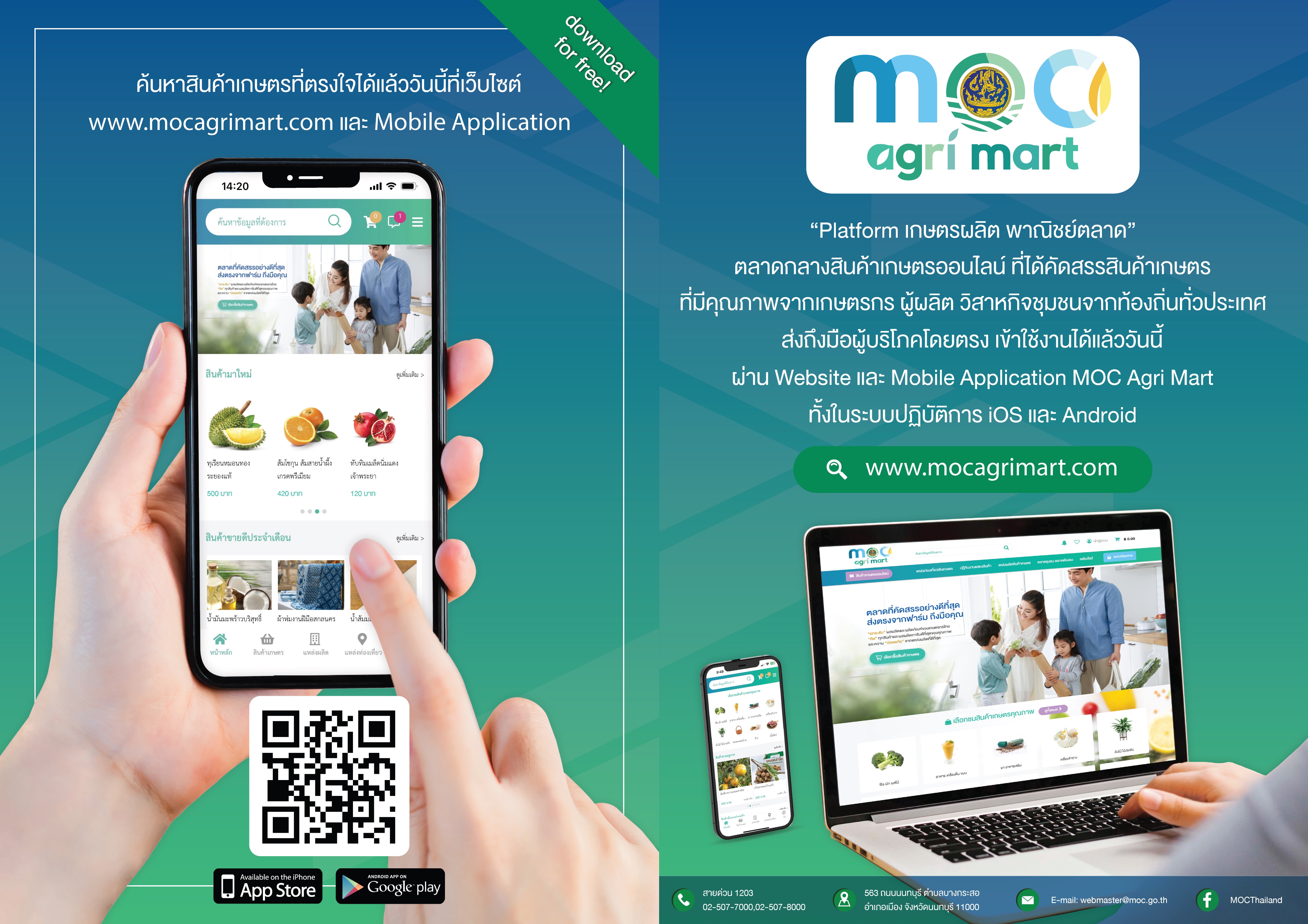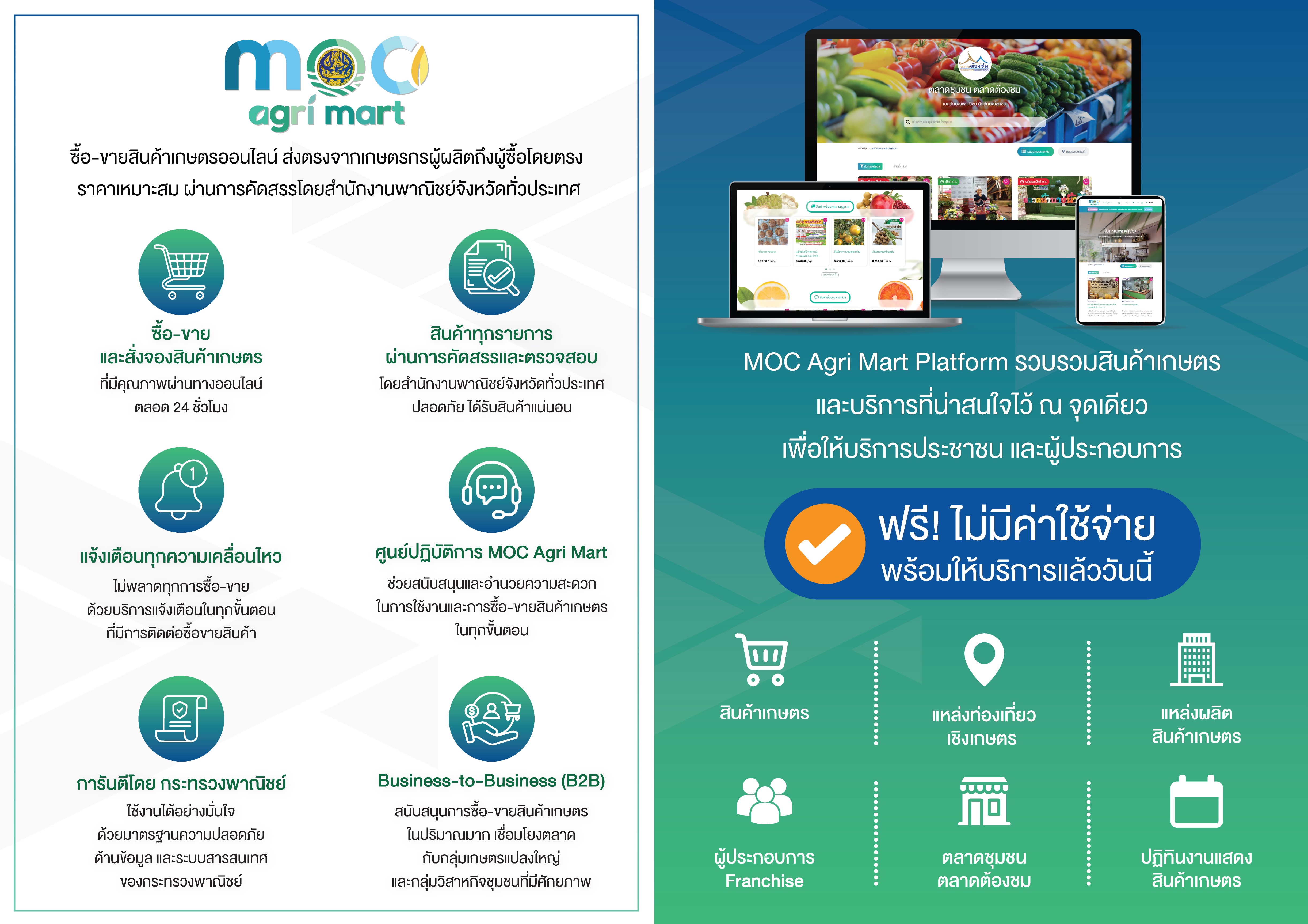 กระทรวงพาณิชยได้จัดทำ Platform " เกษตรผลิต พาณิชย์ตลาด " ระบบบริหารข้อมูลสินค้าเกษตรและตลาดดิจิทัลเพื่อบริการประชาชน เป็นช่องทางในการช่วยเหลือเกษตรกรให้สร้างร้านค้าออนไลน์บน  Platform Platform จึงขอเชิญชวนผุ้ประกอบการ เกษตรกร กลุ่มเกษตรกร สมัครเข้าใช้ Platform " เกษตรผลิต พาณิชย์ตลาด " ผ่านทาง Website : www.mocagrimart.com และ Mobile MOC Agrimart โดยไม่มีค่าใช้จ่าย และประชาชนทั่วไป สามารถเข้าชม เลือกสินค้าได้ตลอด 24 ชั่วโมง