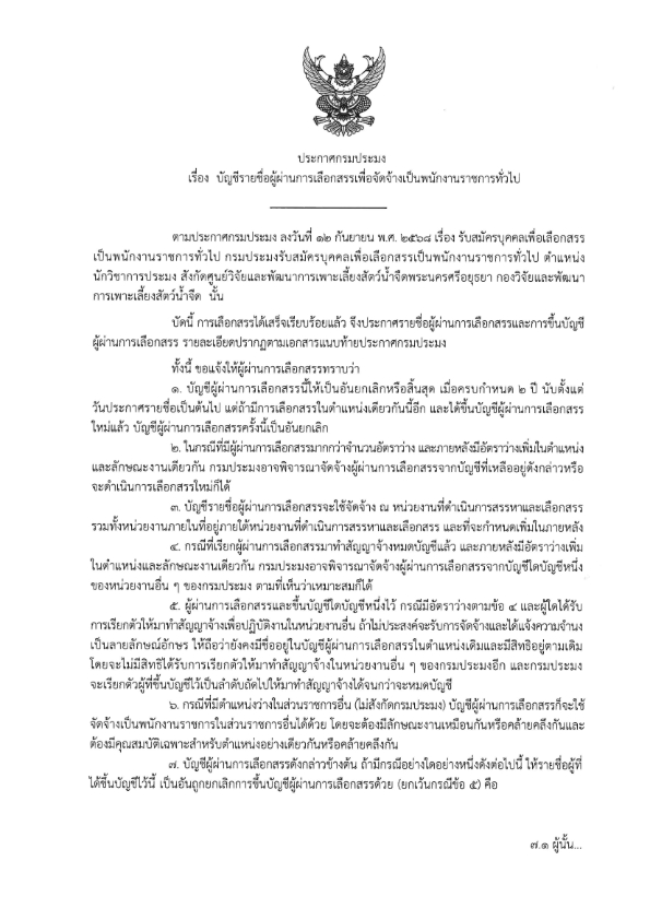 ประกาศกรมประมง เรื่อง บัญชีรายชื่อผู้ผ่านการคัดเลือกสรรเพื่อจัดจ้างเป็นพนักงานราชการทั่วไป