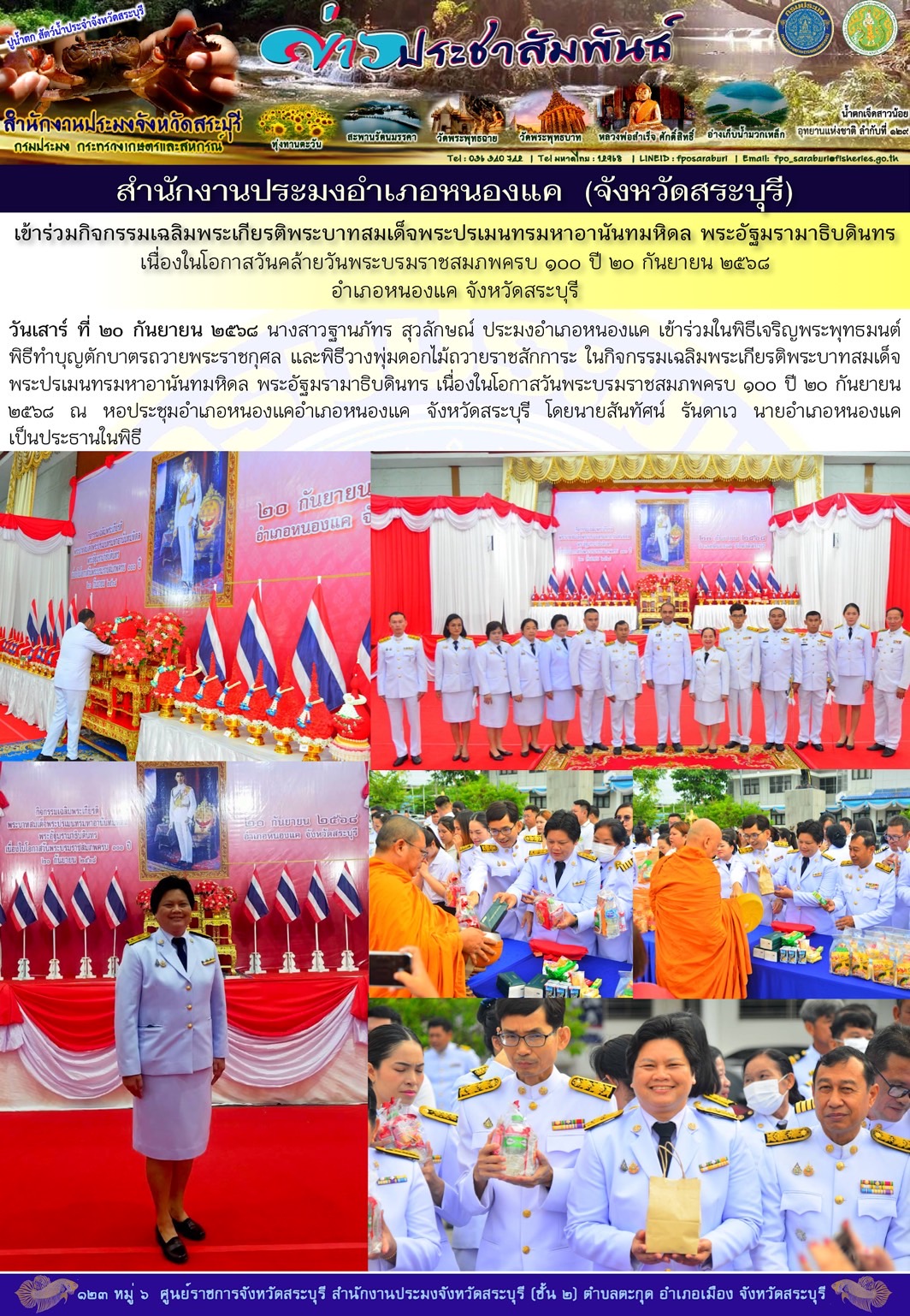 นทร เนื่องในโอกาสวันคล้าย วันพระบรมราชสมภพ ครบ ๑๐๐ ปี ๒๐ กันยายน ๒๕๖๘ ณ ศาลาประชาคมอำเภอแก่งคอย จังหวัดสระบุรี โดยมีนายจิรัญชัย อาทิตย์นพชัย นายอำเภอแก่งคอยเป็นประธานในพิธี