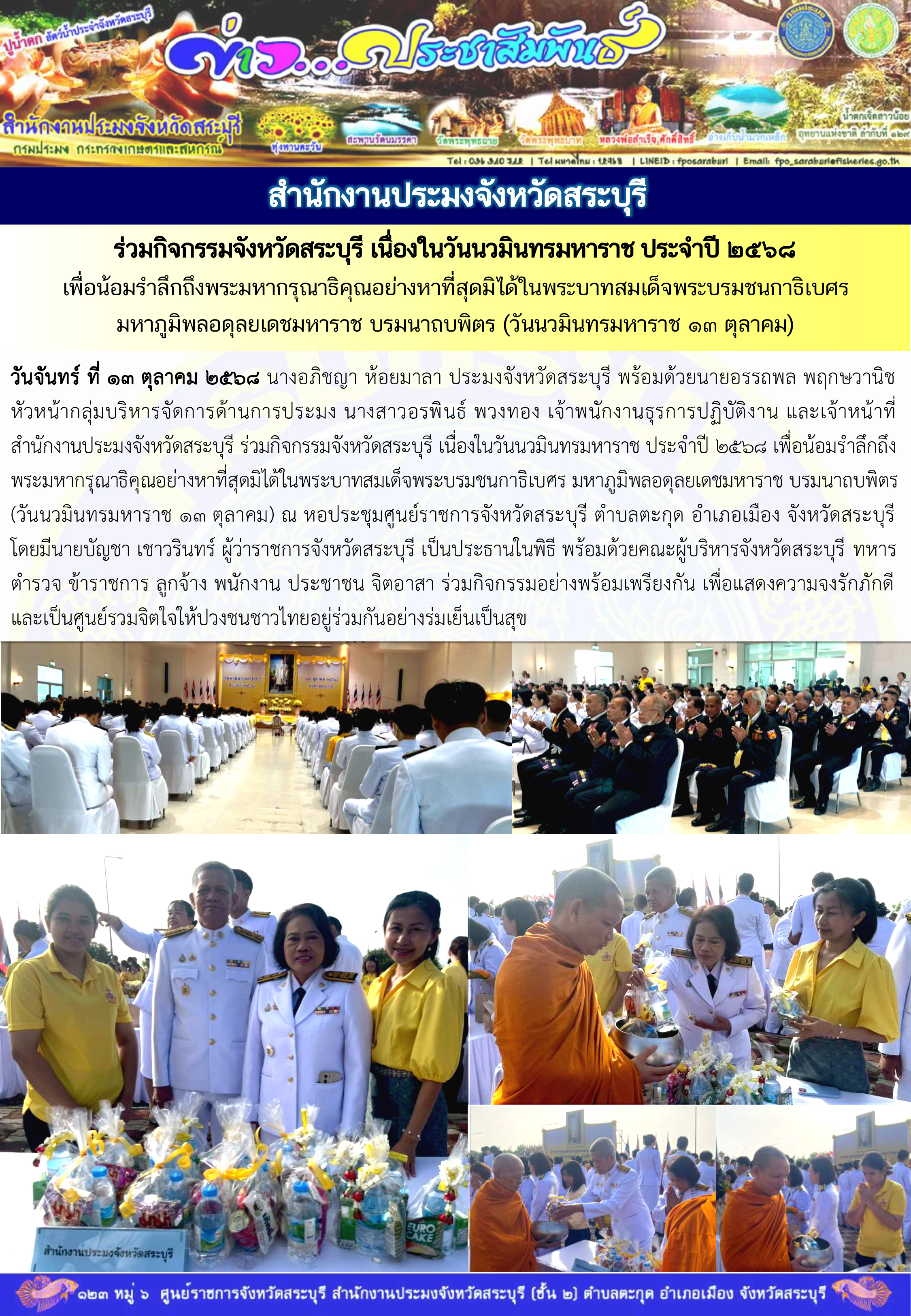 สำนักงานประมงจังหวัดสระบุรี ร่วมกิจกรรมจังหวัดสระบุรี เนื่องในวันนวมินทรมหาราช ประจำปี ๒๕๖๘ เพื่อน้อมรำลึกถึงพระมหากรุณาธิคุณอย่างหาที่สุดมิได้ในพระบาทสมเด็จพระบรมชนกาธิเบศร มหาภูมิพลอดุลยเดชมหาราช บรมนาถบพิตร (วันนวมินทรมหาราช ๑๓ ตุลาคม)