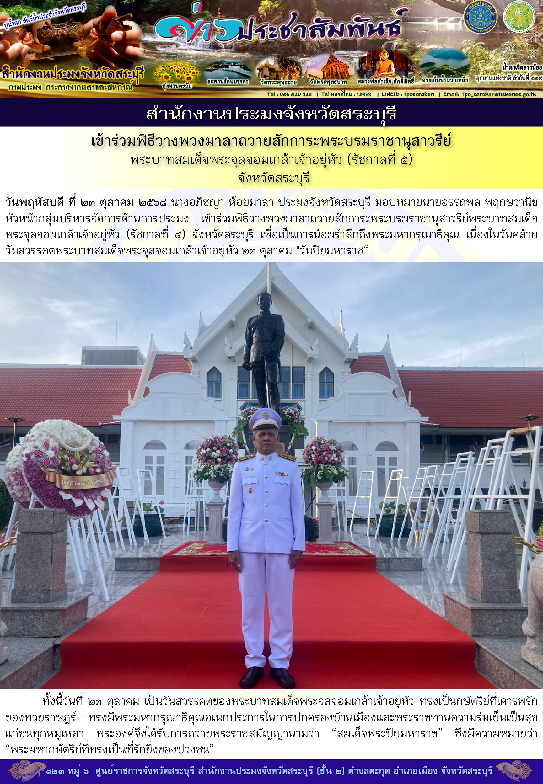 สำนักงานประมงจังหวัดสระบุรี เข้าร่วมพิธีวางพวงมาลาถวายสักการะพระบรมราชานุสาวรีย์พระบาทสมเด็จพระจุลจอมเกล้าเจ้าอยู่หัว (รัชกาลที่ ๕) จังหวัดสระบุรี