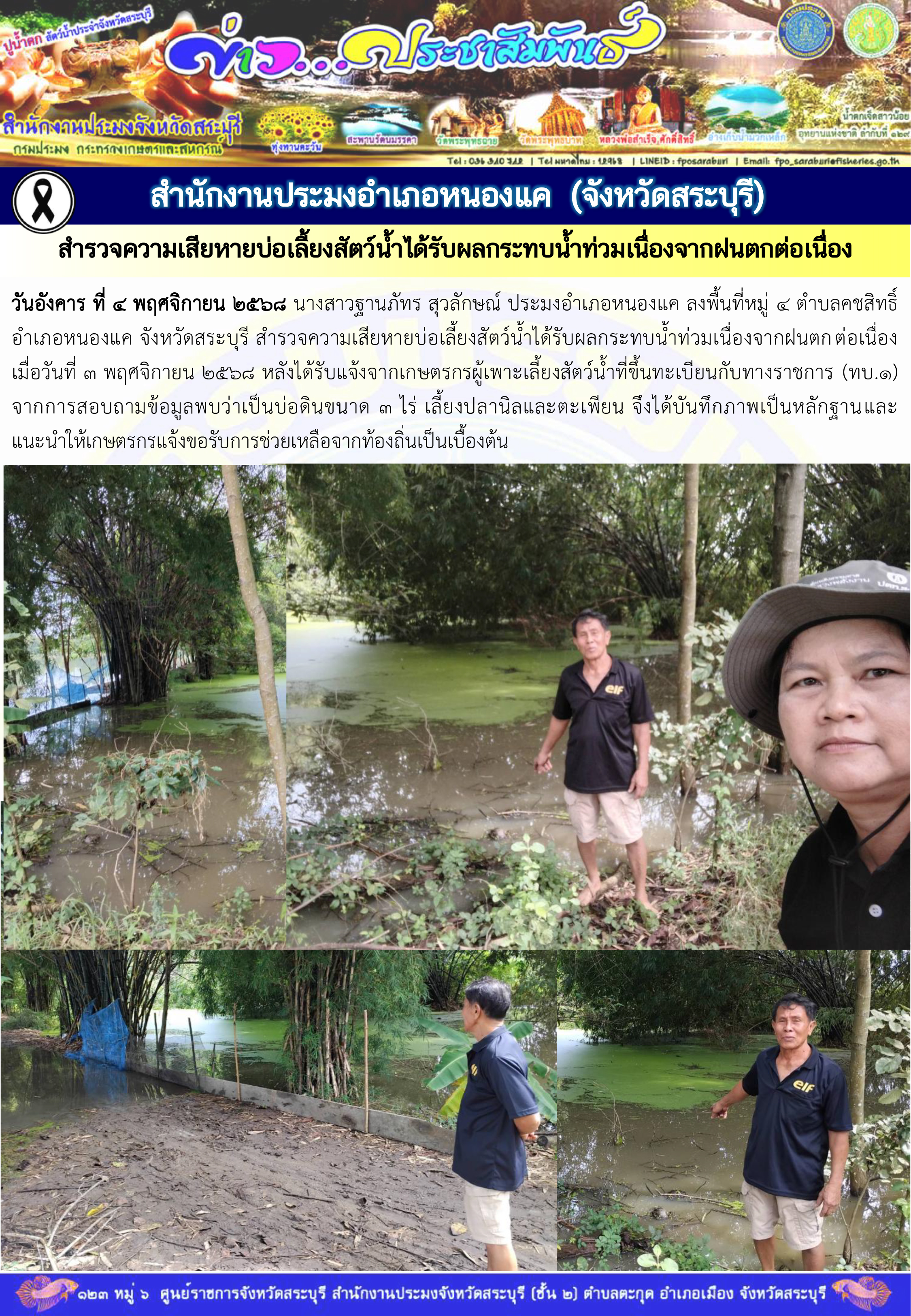 สำนักงานประมงอำเภอหนองแค สำรวจความเสียหายบ่อเลี้ยงสัตว์น้ำได้รับผลกระทบน้ำท่วมเนื่องจากฝนตกต่อเนื่องเมื่อวันที่ ๓ พฤศจิกายน ๒๕๖๘ หลังได้รับแจ้งจากเกษตรกรผู้เพาะเลี้ยงสัตว์น้ำที่ขึ้นทะเบียนกับทางราชการ (ทบ.๑)