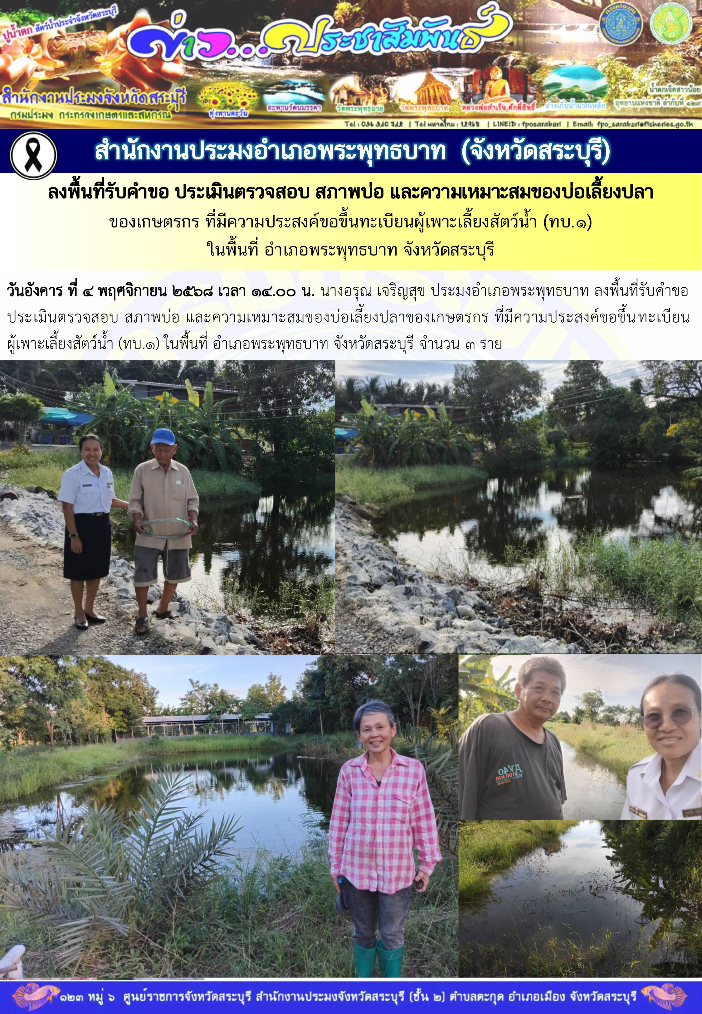 วันอังคาร ที่ ๔ พฤศจิกายน ๒๕๖๘ เวลา ๑๔.๐๐ น. นางอรุณ เจริญสุข ประมงอำเภอพระพุทธบาท ลงพื้นที่รับคำขอ ประเมินตรวจสอบ สภาพบ่อ และความเหมาะสมของบ่อเลี้ยงปลาของเกษตรกร ที่มีความประสงค์ขอขึ้นทะเบียนผู้เพาะเลี้ยงสัตว์น้ำ (ทบ.๑) ในพื้นที่ อำเภอพระพุทธบาท จำนวน ๓ ราย