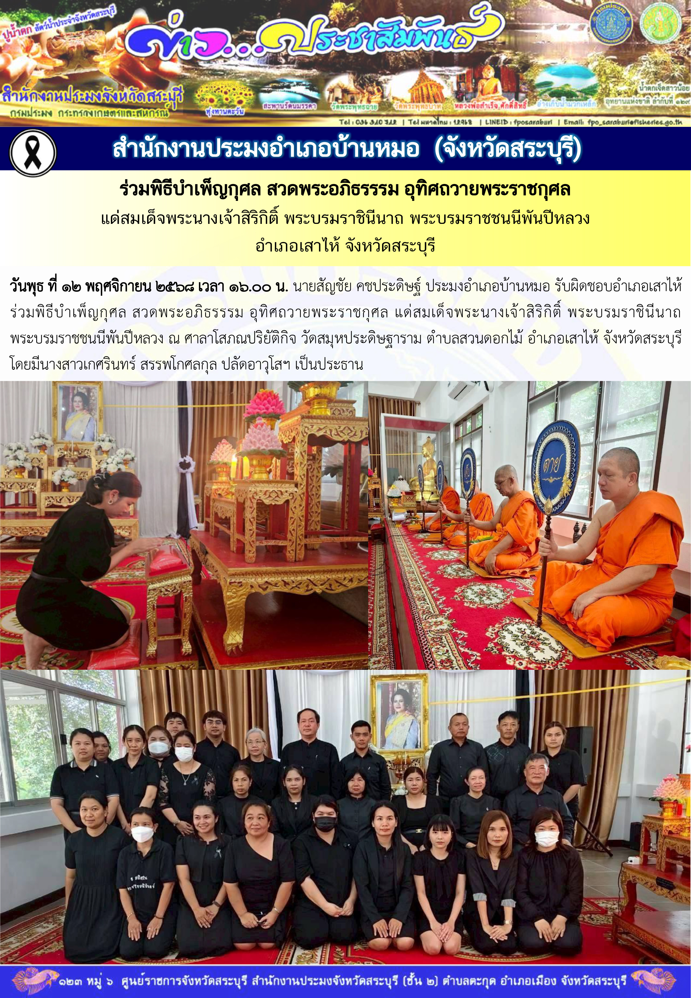 วันพุธ ที่ ๑๒ พฤศจิกายน ๒๕๖๘ เวลา ๑๖.๐๐ น. นายสัญชัย คชประดิษฐ์ ประมงอำเภอบ้านหมอ รับผิดชอบอำเภอเสาไห้ ร่วมพิธีบำเพ็ญกุศล สวดพระอภิธรรรม อุทิศถวายพระราชกุศล แด่สมเด็จพระนางเจ้าสิริกิติ์ พระบรมราชินีนาถ พระบรมราชชนนีพันปีหลวง ณ ศาลาโสภณปริยัติกิจ วัดสมุหประดิษฐาราม ตำบลสวนดอกไม้ อำเภอเสาไห้ จังหวัดสระบุรี โดยมีนางสาวเกศรินทร์ สรรพโกศลกุล ปลัดอาวุโสฯ เป็นประธาน