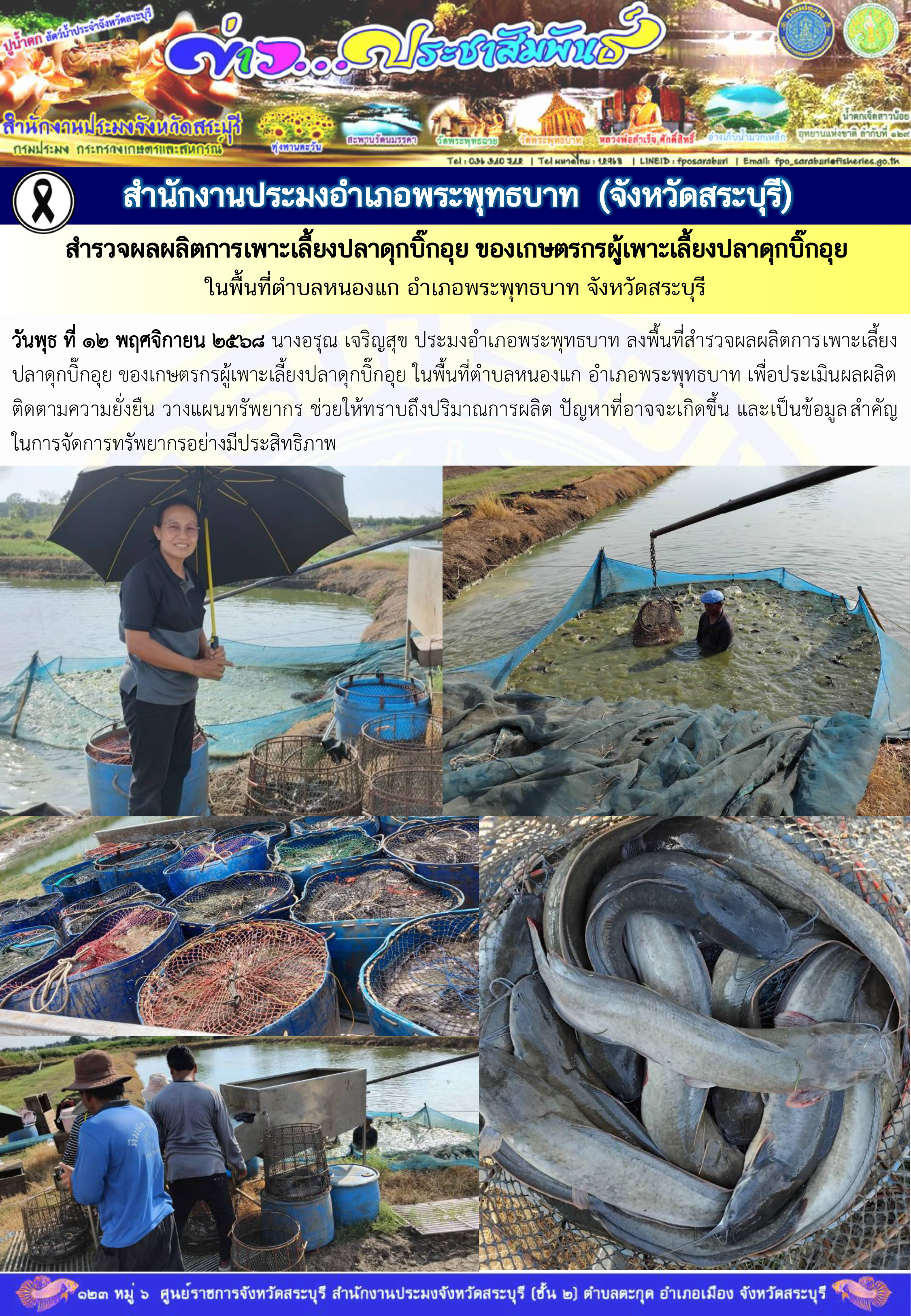 วันพุธ ที่ ๑๒ พฤศจิกายน ๒๕๖๘ นางอรุณ เจริญสุข ประมงอำเภอพระพุทธบาท ลงพื้นที่สำรวจผลผลิตการเพาะเลี้ยงปลาดุกบิ๊กอุย ของเกษตรกรผู้เพาะเลี้ยงปลาดุกบิ๊กอุย ในพื้นที่ตำบลหนองแก อำเภอพระพุทธบาท เพื่อประเมินผลผลิต ติดตามความยั่งยืน วางแผนทรัพยากร ช่วยให้ทราบถึงปริมาณการผลิต ปัญหาที่อาจจะเกิดขึ้น และเป็นข้อมูลสำคัญในการจัดการทรัพยากรอย่างมีประสิทธิภาพ