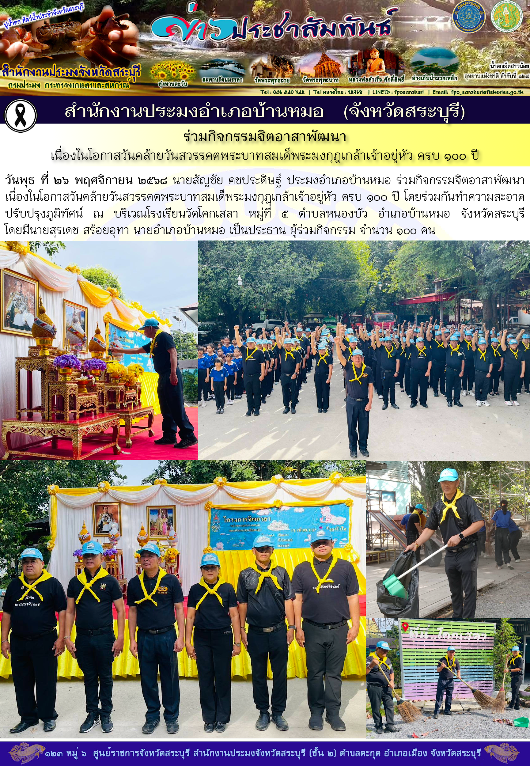 วันพุธ ที่ ๒๖ พฤศจิกายน ๒๕๖๘ นายสัญชัย คชประดิษฐ์ ประมงอำเภอบ้านหมอ ร่วมกิจกรรมจิตอาสาพัฒนา เนื่องในโอกาสวันคล้ายวันสวรรคตพระบาทสมเด็พระมงกุฎเกล้าเจ้าอยู่หัว ครบ ๑๐๐ ปี โดยร่วมกันทำความสะอาดปรับปรุงภูมิทัศน์ ณ บริเวณโรงเรียนวัดโคกเสลา หมู่ที่ ๕ ตำบลหนองบัว อำเภอบ้านหมอ จังหวัดสระบุรี โดยมีนายสุรเดช สร้อยอุทา นายอำเภอบ้านหมอ เป็นประธาน ผู้ร่วมกิจกรรม จำนวน ๑๐๐ คน