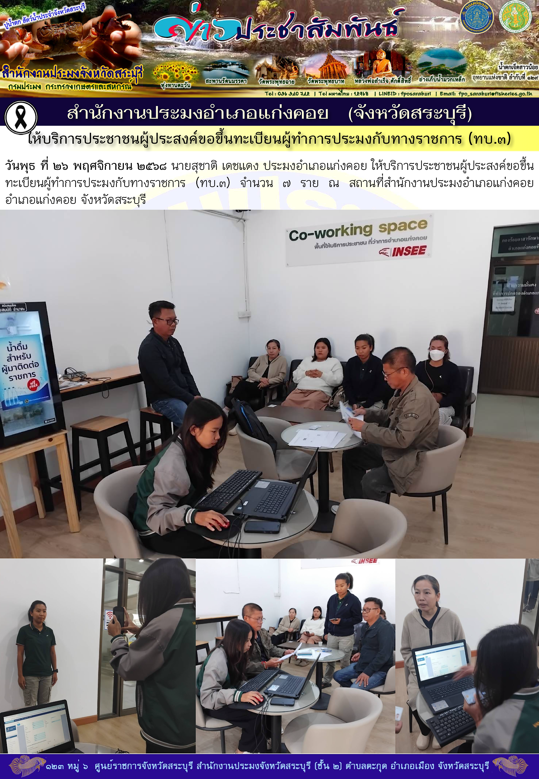 วันพุธ ที่ ๒๖ พฤศจิกายน ๒๕๖๘ นายสุชาติ เดชแดง ประมงอำเภอแก่งคอย ให้บริการประชาชนผู้ประสงค์ขอขึ้นทะเบียนผู้ทำการประมงกับทางราชการ (ทบ.๓) จำนวน ๗ ราย ณ สถานที่สำนักงานประมงอำเภอแก่งคอย อำเภอแก่งคอย จังหวัดสระบุรี
