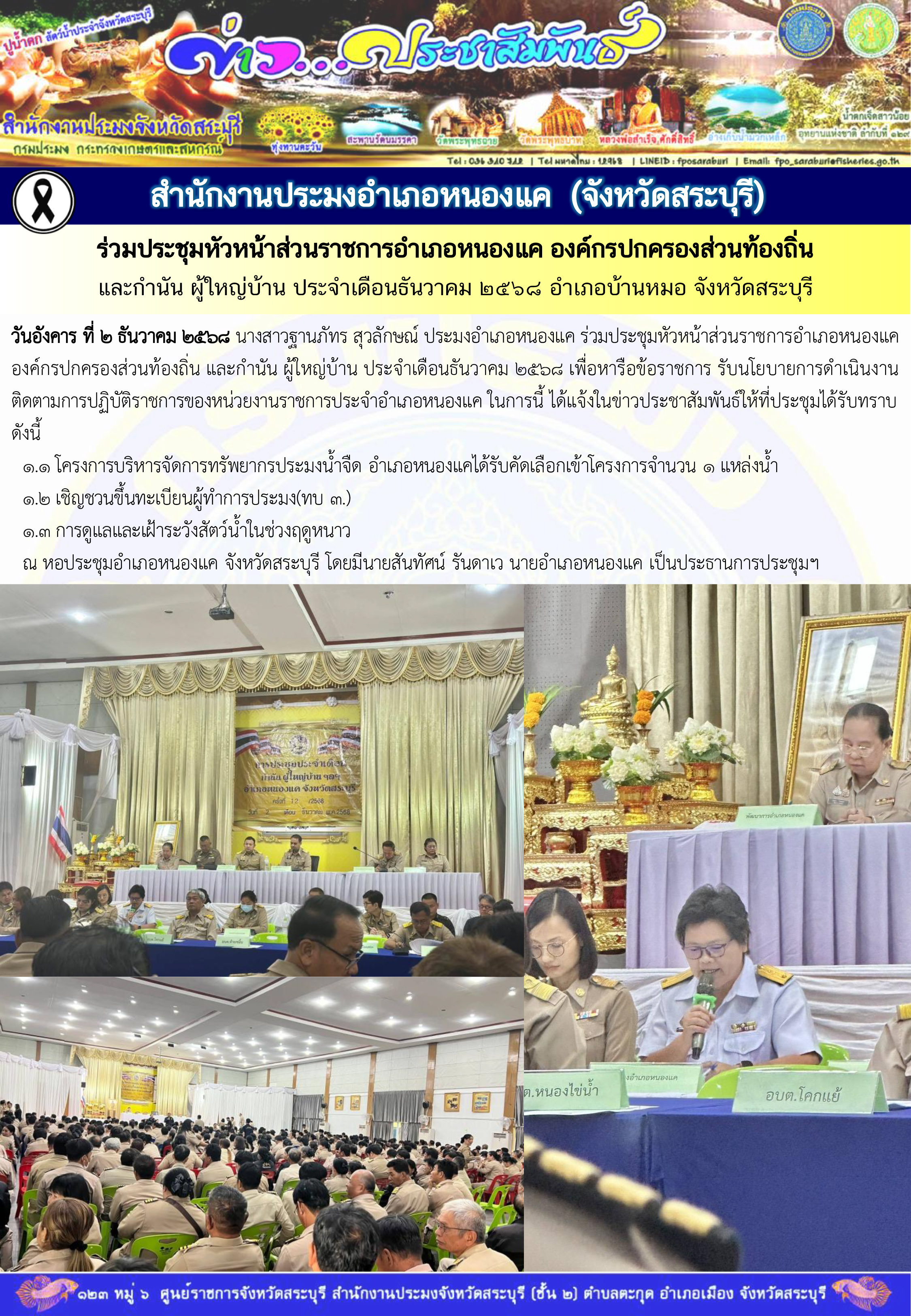 วันอังคาร ที่ ๒ ธันวาคม ๒๕๖๘ นางสาวฐานภัทร สุวลักษณ์ ประมงอำเภอหนองแค ร่วมประชุมหัวหน้าส่วนราชการอำเภอหนองแค องค์กรปกครองส่วนท้องถิ่น และกำนัน ผู้ใหญ่บ้าน ประจำเดือนธันวาคม ๒๕๖๘ เพื่อหารือข้อราชการ รับนโยบายการดำเนินงาน ติดตามการปฏิบัติราชการของหน่วยงานราชการประจำอำเภอหนองแค ในการนี้ ได้แจ้งในข่าวประชาสัมพันธ์ให้ที่ประชุมได้รับทราบ ดังนี้