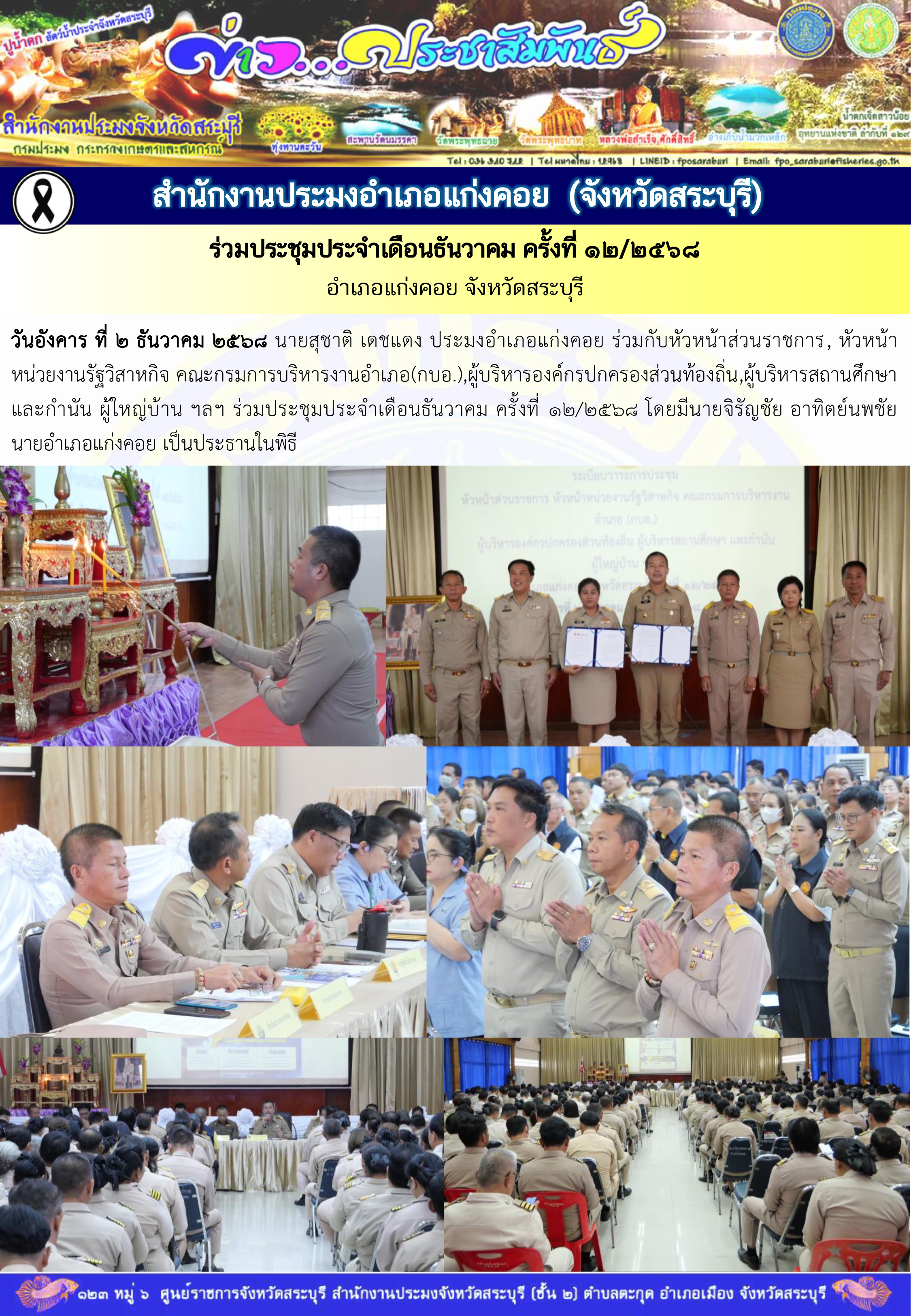 วันอังคาร ที่ ๒ ธันวาคม ๒๕๖๘ นายสุชาติ เดชแดง ประมงอำเภอแก่งคอย ร่วมกับหัวหน้าส่วนราชการ,หัวหน้าหน่วยงานรัฐวิสาหกิจ คณะกรมการบริหารงานอำเภอ(กบอ.),ผู้บริหารองค์กรปกครองส่วนท้องถิ่น,ผู้บริหารสถานศึกษา และกำนัน ผู้ใหญ่บ้าน ฯลฯ ร่วมประชุมประจำเดือนธันวาคม ครั้งที่ ๑๒/๒๕๖๘ โดยมีนายจิรัญชัย อาทิตย์นพชัย นายอำเภอแก่งคอย เป็นประธานในพิธี