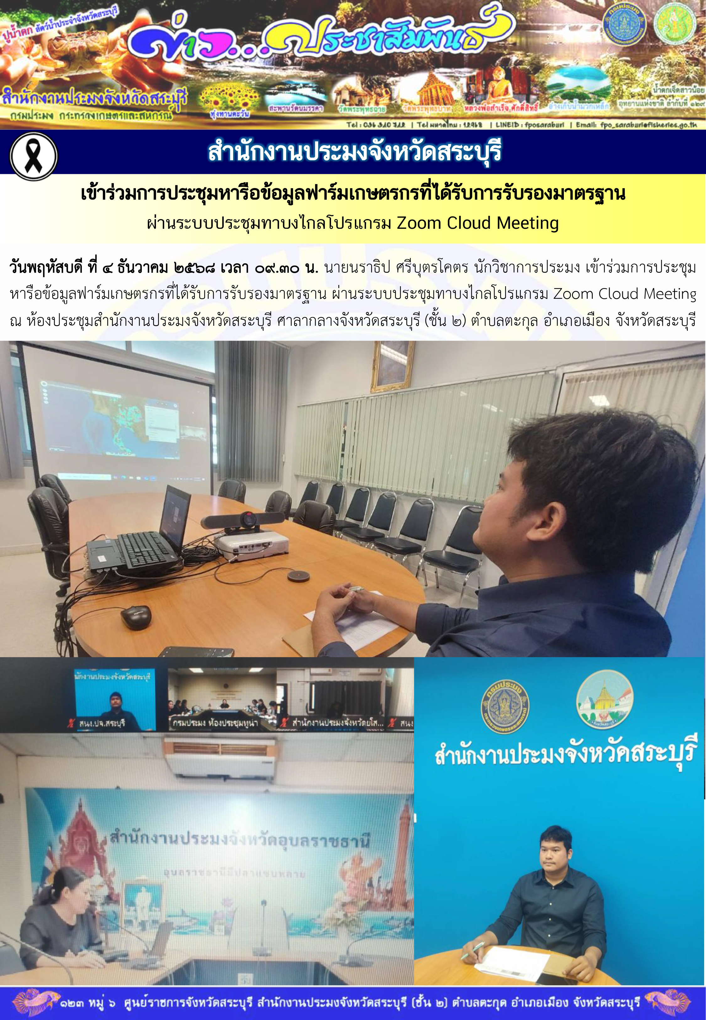 สำนักงานประมงจังหวัดสระบุรี เข้าร่วมการประชุมหารือข้อมูลฟาร์มเกษตรกรที่ได้รับการรับรองมาตรฐาน ผ่านระบบประชุมทาบงไกลโปรแกรม Zoom Cloud Meeting