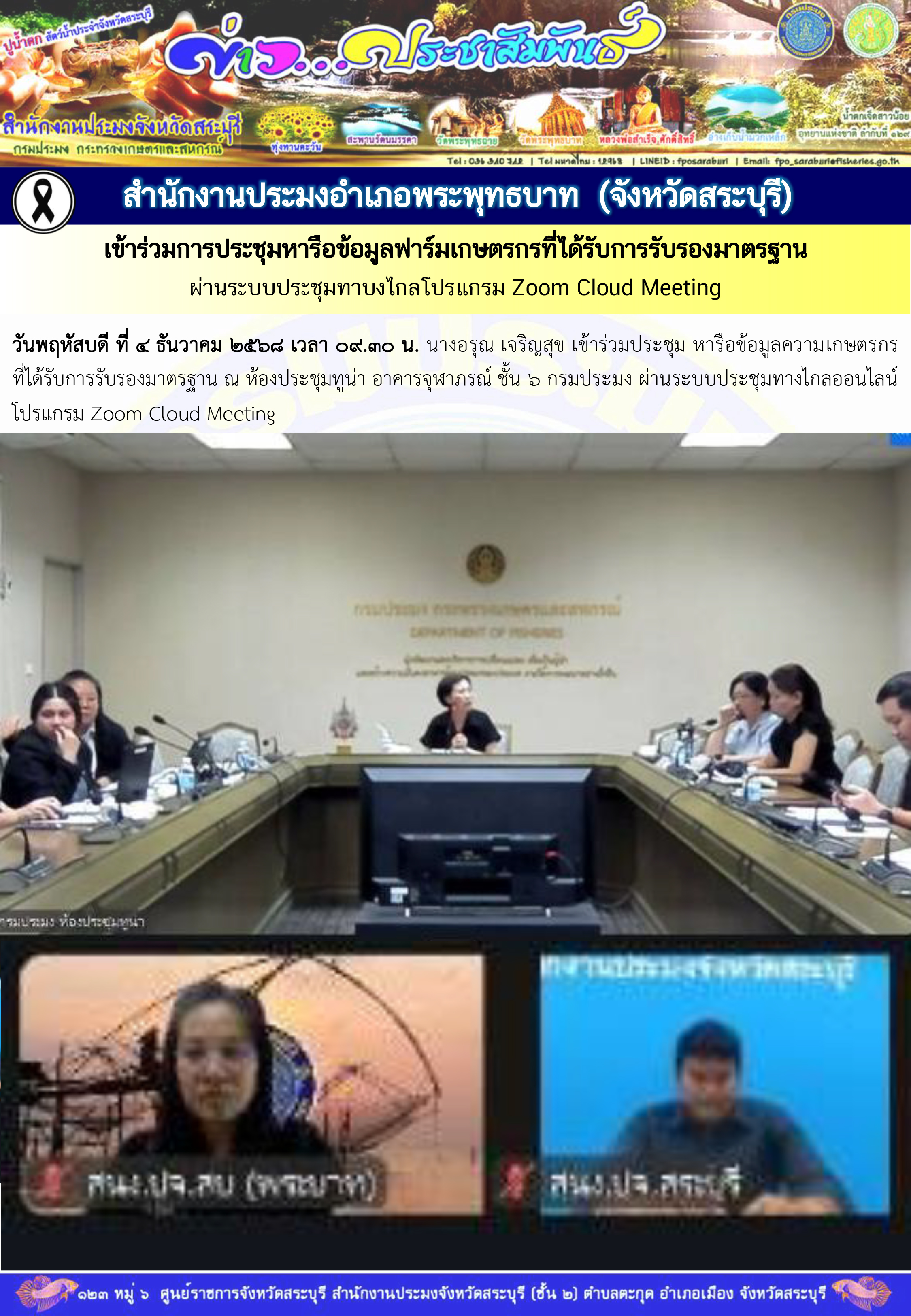 วันพฤหัสบดี ที่ ๔ ธันวาคม ๒๕๖๘ เวลา ๐๙.๓๐ น. นางอรุณ เจริญสุข ประมงอำเภอพระพุทธบาท เข้าร่วมประชุม หารือข้อมูลความเกษตรกร ที่ได้รับการรับรองมาตรฐาน ณ ห้องประชุมทูน่า อาคารจุฬาภรณ์ ชั้น 6 กรมประมง ผ่านระบบประชุมทางไกลออนไลน์โปรแกรม Zoom Cloud Meeting