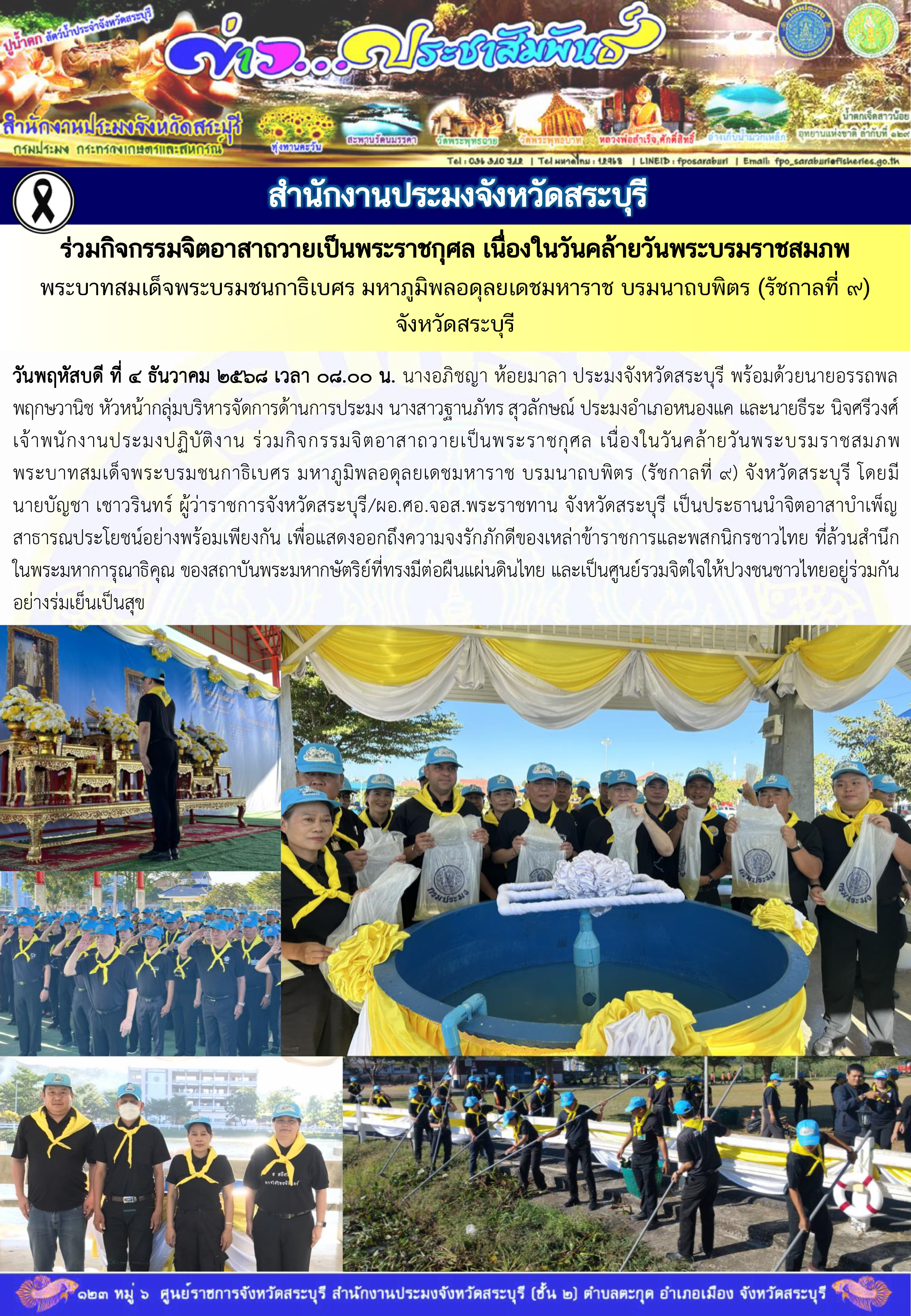 วันพฤหัสบดี ที่ ๔ ธันวาคม ๒๕๖๘ เวลา ๐๘.๐๐ น. นางอภิชญา ห้อยมาลา ประมงจังหวัดสระบุรี พร้อมด้วยนายอรรถพล พฤกษวานิช หัวหน้ากลุ่มบริหารจัดการด้านการประมง นางสาวฐานภัทร สุวลักษณ์ ประมงอำเภอหนองแค และนายธีระ นิจศรีวงศ์ เจ้าพนักงานประมงปฏิบัติงาน ร่วมกิจกรรมจิตอาสาถวายเป็นพระราชกุศล เนื่องในวันคล้ายวันพระบรมราชสมภพ พระบาทสมเด็จพระบรมชนกาธิเบศร มหาภูมิพลอดุลยเดชมหาราช บรมนาถบพิตร (รัชกาลที่ ๙) จังหวัดสระบุรี โดยมีนายบัญชา เชาวรินทร์ ผู้ว่าราชการจังหวัดสระบุรี/ผอ.ศอ.จอส.พระราชทาน จังหวัดสระบุรี เป็นประธานนำจิตอาสาบำเพ็ญสาธารณประโยชน์อย่างพร้อมเพียงกัน เพื่อแสดงออกถึงความจงรักภักดีของเหล่าข้าราชการและพสกนิกรชาวไทย ที่ล้วนสำนึกในพระมหาการุณาธิคุณ ของสถาบันพระมหากษัตริย์ที่ทรงมีต่อผืนแผ่นดินไทย และเป็นศูนย์รวมจิตใจให้ปวงชนชาวไทยอยู่ร่วมกันอย่างร่มเย็นเป็นสุข