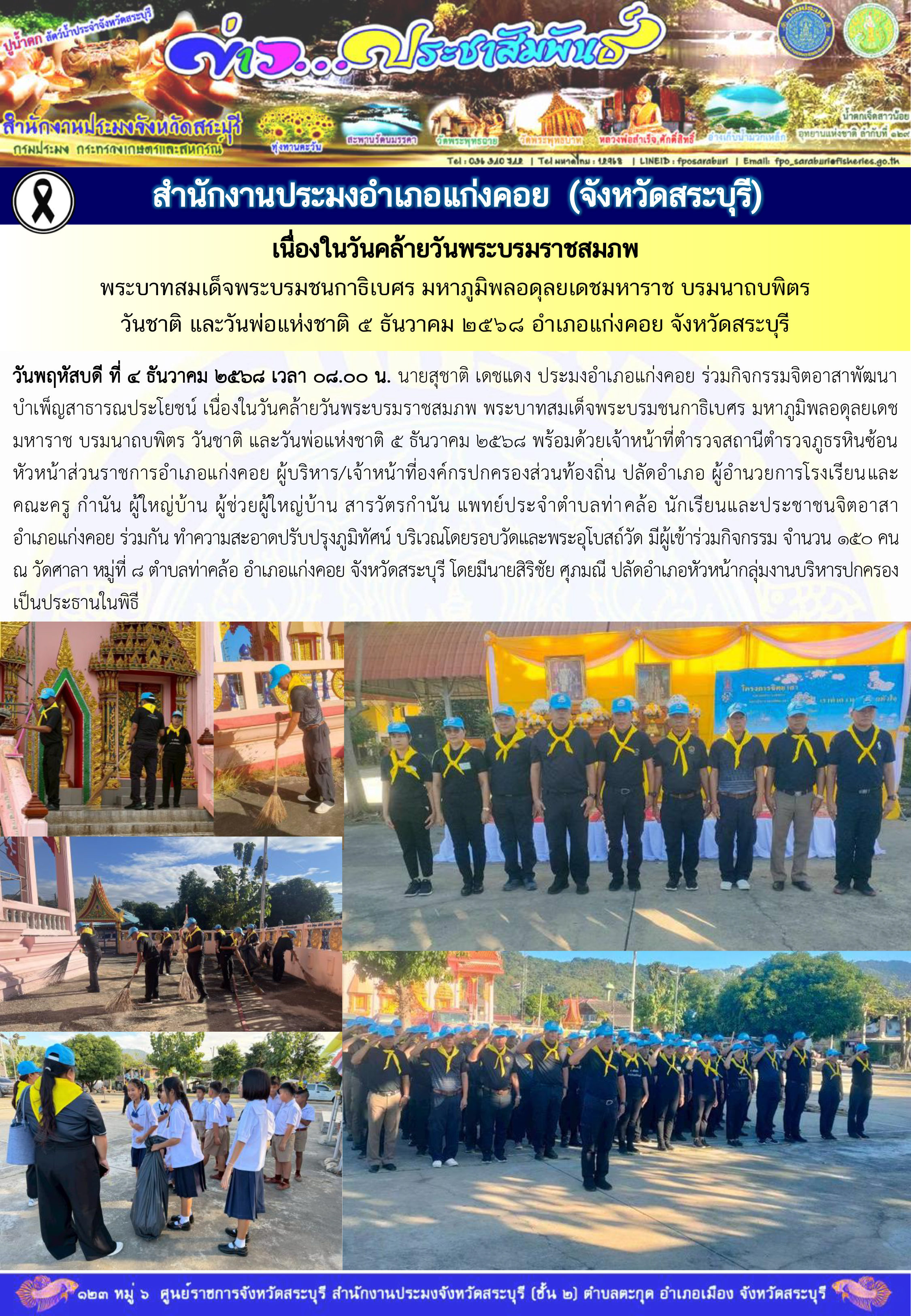 วันพฤหัสบดี ที่ ๔ ธันวาคม ๒๕๖๘ เวลา ๐๘.๐๐ น. นายสุชาติ เดชแดง ประมงอำเภอแก่งคอย ร่วมกิจกรรมจิตอาสาพัฒนาบำเพ็ญสาธารณประโยชน์ เนื่องในวันคล้ายวันพระบรมราชสมภพ พระบาทสมเด็จพระบรมชนกาธิเบศร มหาภูมิพลอดุลยเดชมหาราช บรมนาถบพิตร วันชาติ และวันพ่อแห่งชาติ ๕ ธันวาคม ๒๕๖๘ พร้อมด้วยเจ้าหน้าที่ตำรวจสถานีตำรวจภูธรหินซ้อน หัวหน้าส่วนราชการอำเภอแก่งคอย ผู้บริหาร/เจ้าหน้าที่องค์กรปกครองส่วนท้องถิ่น ปลัดอำเภอ ผู้อำนวยการโรงเรียนและคณะครู กำนัน ผู้ใหญ่บ้าน ผู้ช่วยผู้ใหญ่บ้าน สารวัตรกำนัน แพทย์ประจำตำบลท่าคล้อ นักเรียนและประชาชนจิตอาสา อำเภอแก่งคอย ร่วมกัน ทำความสะอาดปรับปรุงภูมิทัศน์ บริเวณโดยรอบวัดและพระอุโบสถ์วัด มีผู้เข้าร่วมกิจกรรม จำนวน ๑๕๐ คน ณ วัดศาลา หมู่ที่ ๘ ตำบลท่าคล้อ อำเภอแก่งคอย จังหวัดสระบุรี โดยมีนายสิริชัย ศุภมณี ปลัดอำเภอหัวหน้ากลุ่มงานบริหารปกครอง เป็นประธานในพิธี