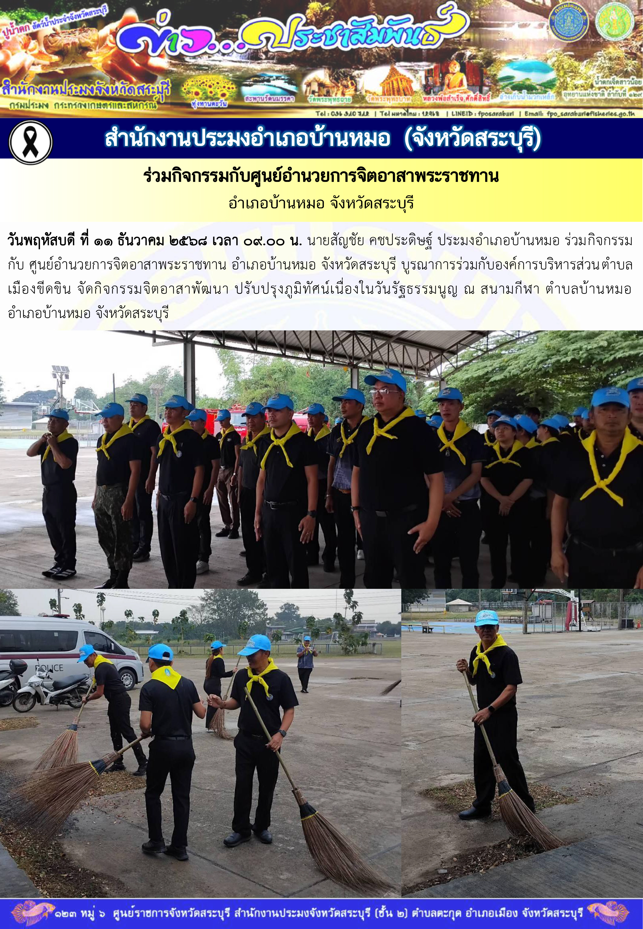 วันพฤหัสบดี ที่ ๑๑ ธันวาคม ๒๕๖๘ เวลา ๐๙.๐๐ น. นายสัญชัย คชประดิษฐ์ ประมงอำเภอบ้านหมอ ร่วมกิจกรรมกับ ศูนย์อำนวยการจิตอาสาพระราชทาน อำเภอบ้านหมอ จังหวัดสระบุรี บูรณาการร่วมกับองค์การบริหารส่วนตำบลเมืองขีดขิน จัดกิจกรรมจิตอาสาพัฒนา ปรับปรุงภูมิทัศน์เนื่องในวันรัฐธรรมนูญ ณ สนามกีฬา ตำบลบ้านหมอ อำเภอบ้านหมอ จังหวัดสระบุรี