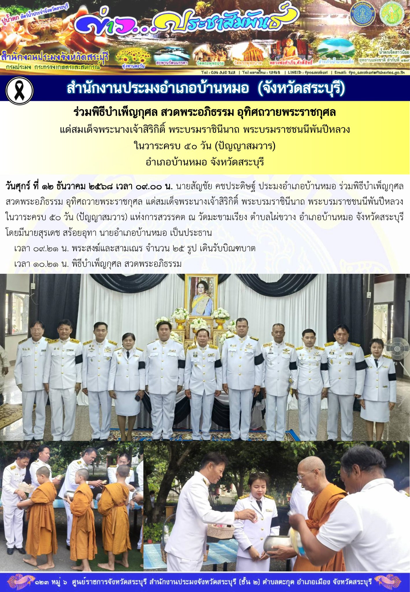 วันศุกร์ที่ ๑๒ ธันวาคม ๒๕๖๘ เวลา ๐๗.๐๐ น. นางอภิชญา ห้อยมาลา ประมงจังหวัดสระบุรี พร้อมด้วยนายอรรถพล พฤกษวานิช หัวหน้ากลุ่มบริหารจัดการด้านการประมง และนางสาวฐานภัทร สุวลักษณ์ ประมงอำเภอหนองแค ร่วมกิจกรรมจังหวัดสระบุรี พิธีทำบุญตักบาตร และพิธีบำเพ็ญกุศลปัญญาสมวาร ๕๐ วัน เพื่ออุทิศถวายเป็นพระราชกุศล สมเด็จพระนางเจ้าสิริกิติ์ พระบรมราชินีนาถ พระบรมราชชนนีพันปีหลวง ณ วัดพระพุทธแสงธรรม ตำบลหนองนาก อำเภอหนองแค จังหวัดสระบุรี โดยมีคณะสงฆ์จังหวัดสระบุรี คณะผู้บริหารจังหวัดสระบุรี หน่วยงานราชการ หน่วยงานรัฐวิสาหกิจ องค์กรปกครองส่วนท้องถิ่น สถานศึกษา องค์กรภาคเอกชน และพุทธศาสนิกชนชาวจังหวัดสระบุรี ร่วมบำเพ็ญกุศลด้วยการสวดมนต์ เจริญจิตตภาวนา รักษาศีล ฟังธรรม และปฏิบัติธรรม เพื่ออุทิศถวายพระราชกุศล และร่วมถวายความอาลัยโดยพร้อมเพรียงกัน
