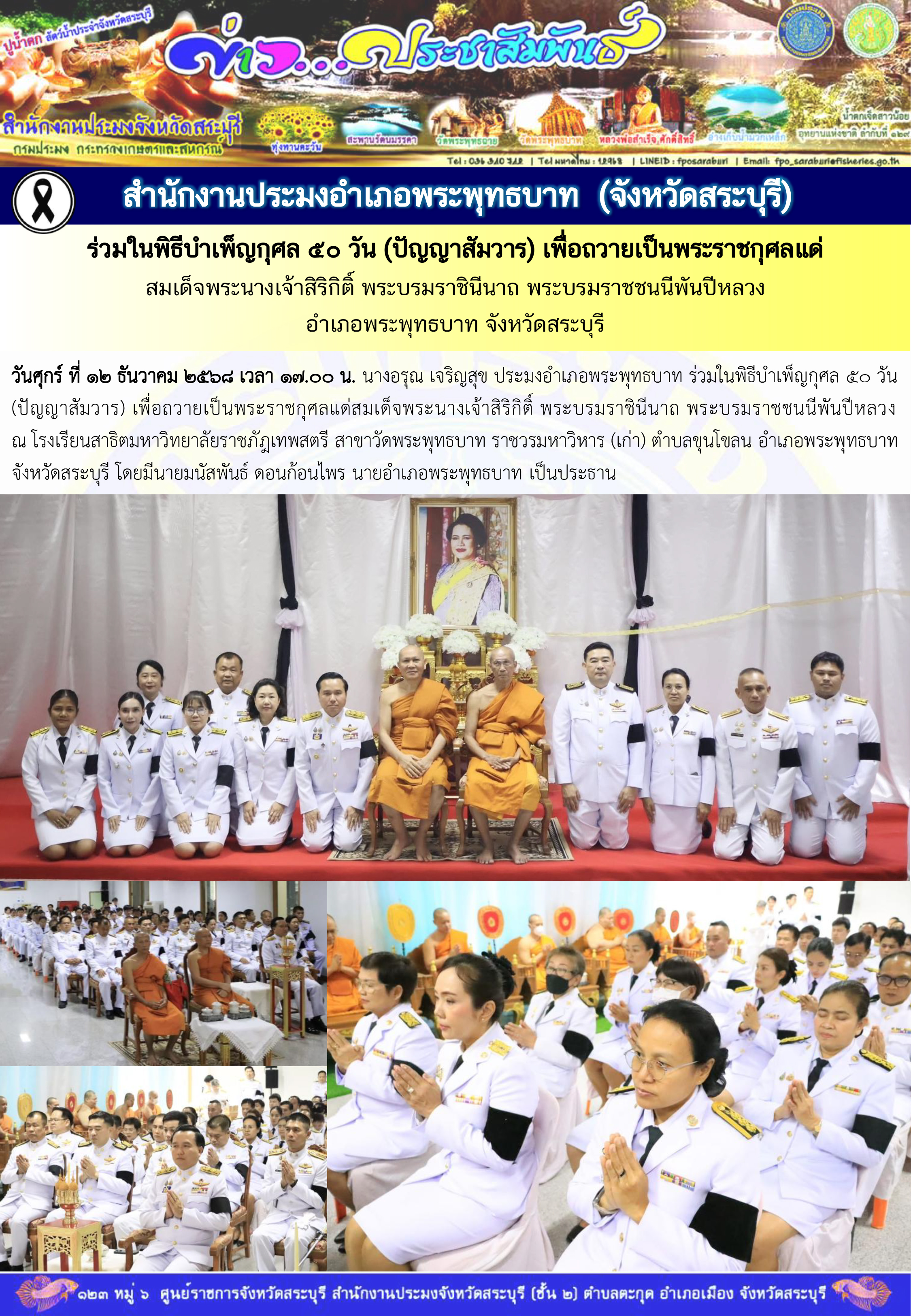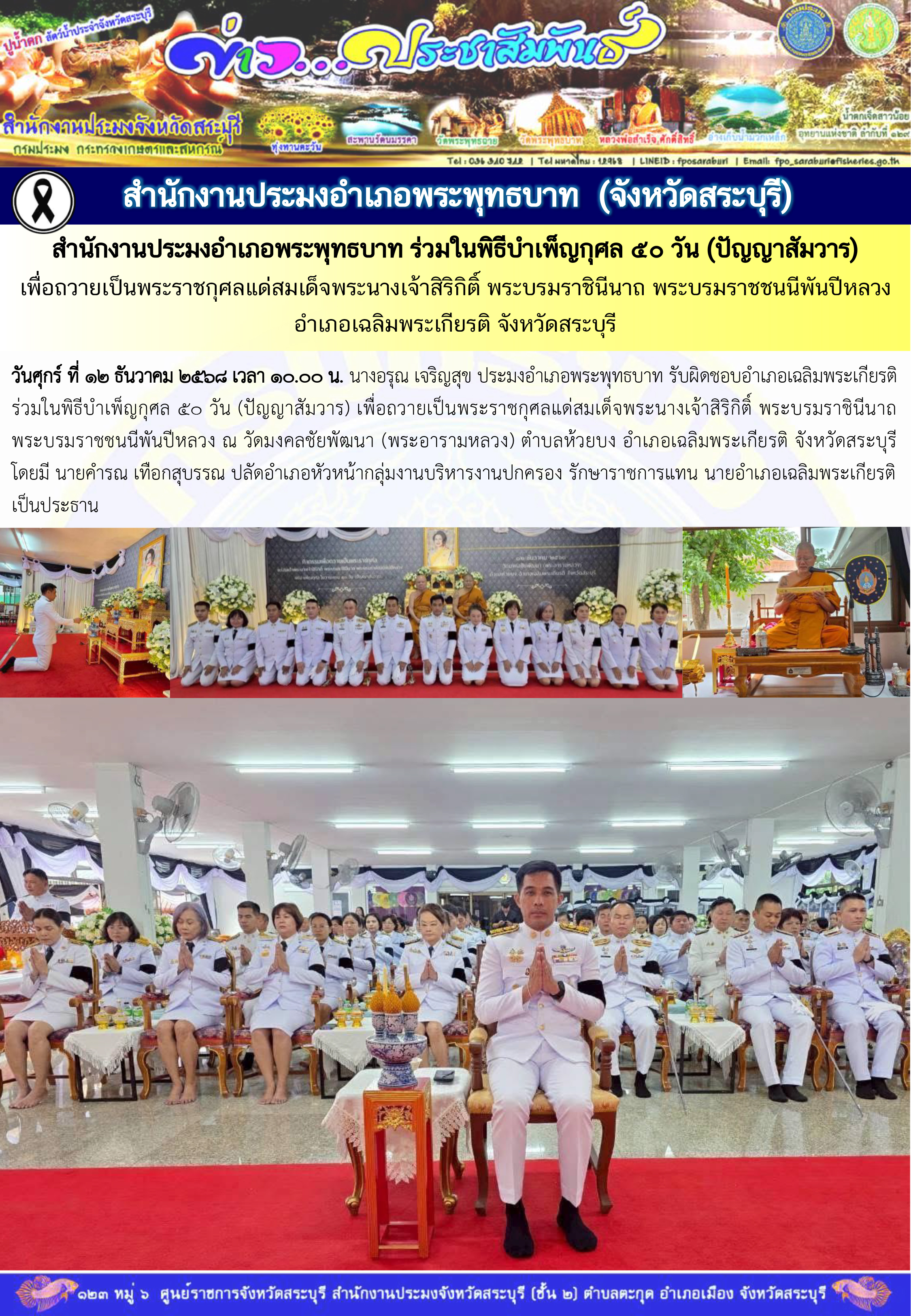 วันศุกร์ ที่ ๑๒ ธันวาคม ๒๕๖๘ เวลา ๑๐.๐๐ น. นางอรุณ เจริญสุข ประมงอำเภอพระพุทธบาท รับผิดชอบอำเภอเฉลิมพระเกียรติ ร่วมในพิธีบำเพ็ญกุศล ๕๐ วัน (ปัญญาสัมวาร) เพื่อถวายเป็นพระราชกุศลแด่สมเด็จพระนางเจ้าสิริกิติ์ พระบรมราชินีนาถ พระบรมราชชนนีพันปีหลวง ณ วัดมงคลชัยพัฒนา (พระอารามหลวง) ตำบลห้วยบง อำเภอเฉลิมพระเกียรติ จังหวัดสระบุรี โดยมี นายคำรณ เทือกสุบรรณ ปลัดอำเภอหัวหน้ากลุ่มงานบริหารงานปกครอง รักษาราชการแทน นายอำเภอเฉลิมพระเกียรติ เป็นประธาน