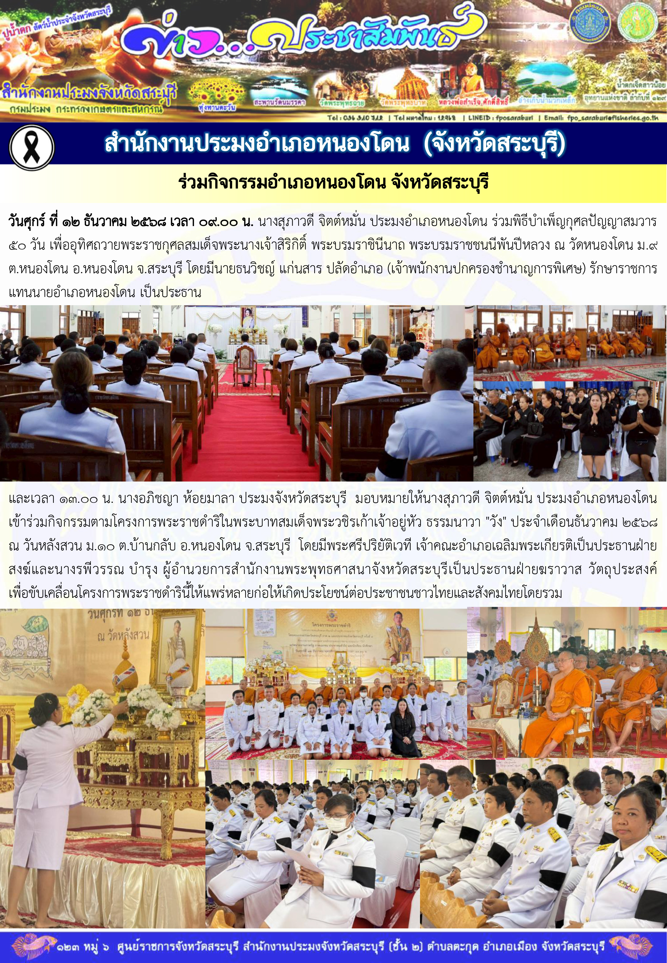 วันศุกร์ ที่ ๑๒ ธันวาคม ๒๕๖๘ เวลา ๐๙.๐๐ น. นางสุภาวดี จิตต์หมั่น ประมงอำเภอหนองโดน ร่วมพิธีบำเพ็ญกุศลปัญญาสมวาร ๕๐ วัน เพื่ออุทิศถวายพระราชกุศลสมเด็จพระนางเจ้าสิริกิติ์ พระบรมราชินีนาถ พระบรมราชชนนีพันปีหลวง ณ วัดหนองโดน ม.๙ ต.หนองโดน อ.หนองโดน จ.สระบุรี โดยมีนายธนวิชญ์ แก่นสาร ปลัดอำเภอ (เจ้าพนักงานปกครองชำนาญการพิเศษ) รักษาราชการแทนนายอำเภอหนองโดน เป็นประธาน และเวลา ๑๓.๐๐ น. นางอภิชญา ห้อยมาลา ประมงจังหวัดสระบุรี  มอบหมายให้นางสุภาวดี จิตต์หมั่น ประมงอำเภอหนองโดน เข้าร่วมกิจกรรมตามโครงการพระราชดำริในพระบาทสมเด็จพระวชิรเก้าเจ้าอยู่หัว ธรรมนาวา "วัง" ประจำเดือนธันวาคม ๒๕๖๘ ณ วันหลังสวน ม.๑๐ ต.บ้านกลับ อ.หนองโดน จ.สระบุรี  โดยมีพระศรีปริยัติเวที เจ้าคณะอำเภอเฉลิมพระเกียรติเป็นประธานฝ่ายสงฆ์และนางรพีวรรณ บำรุง ผู้อำนวยการสำนักงานพระพุทธศาสนาจังหวัดสระบุรีเป็นประธานฝ่ายฆราวาส วัตถุประสงค์เพื่อขับเคลื่อนโครงการพระราชดำรินี้ให้แพร่หลายก่อให้เกิดประโยชน์ต่อประชาชนชาวไทยและสังคมไทยโดยรวม