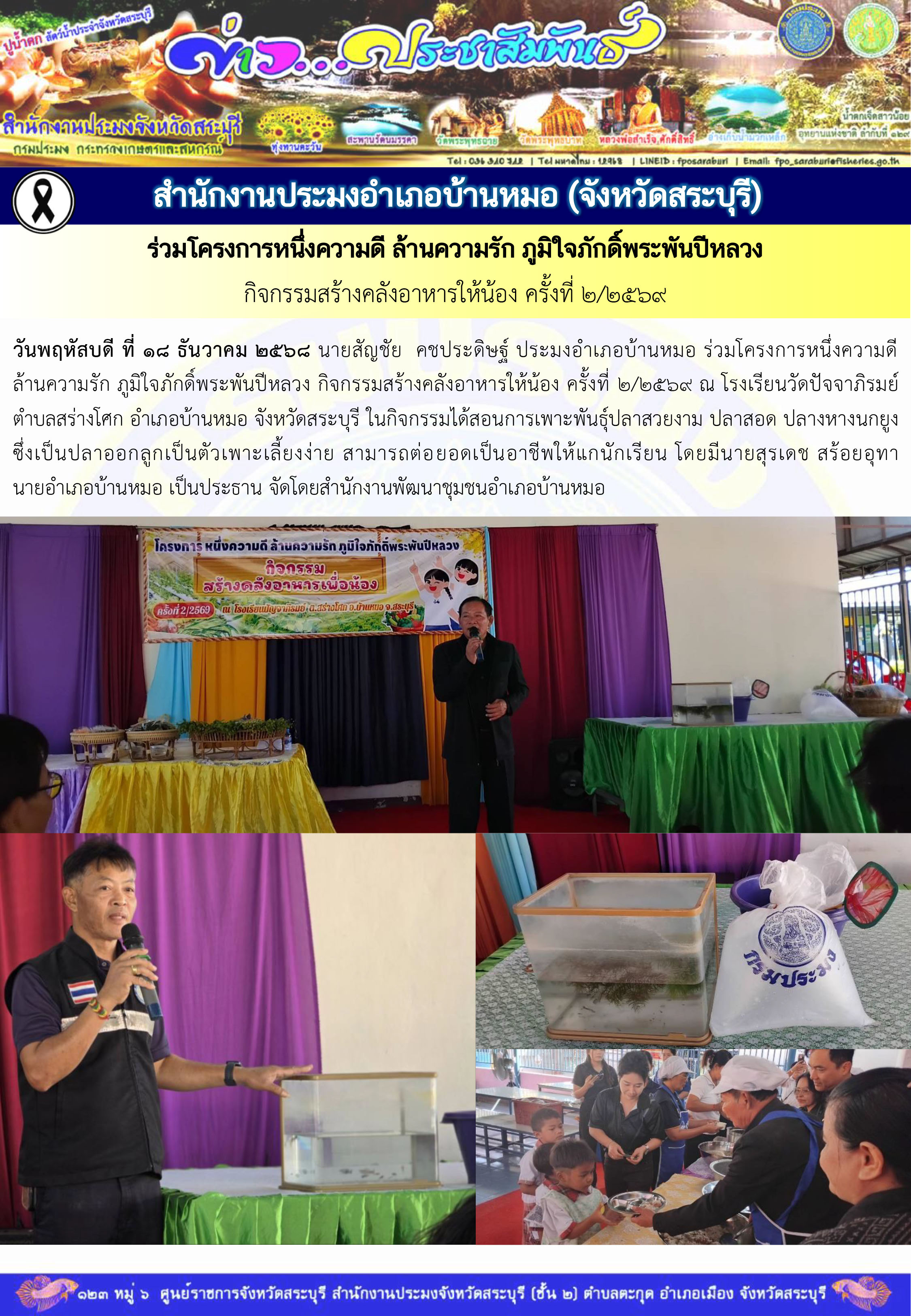 วันพฤหัสบดี ที่ 18 ธันวาคม 2568 นายสัญชัย  คชประดิษฐ์ ประมงอำเภอบ้านหมอ ร่วมโครงการหนึ่งความดี ล้านความรัก ภูมิใจภักดิ์พระพันปีหลวง กิจกรรมสร้างคลังอาหารให้น้อง ครั้งที่ 2/2569 ณ โรงเรียนวัดปัจจาภิรมย์ ตำบลสร่างโศก อำเภอบ้านหมอ จังหวัดสระบุรี ในกิจกรรมได้สอนการเพาะพันธุ์ปลาสวยงาม ปลาสอด ปลางหางนกยูง ซึ่งเป็นปลาออกลูกเป็นตัวเพาะเลี้ยงง่าย สามารถต่อยอดเป็นอาชีพให้แกนักเรียน โดยมีนายสุรเดช สร้อยอุทา นายอำเภอบ้านหมอ เป็นประธาน จัดโดยสำนักงานพัฒนาชุมชนอำเภอบ้านหมอ