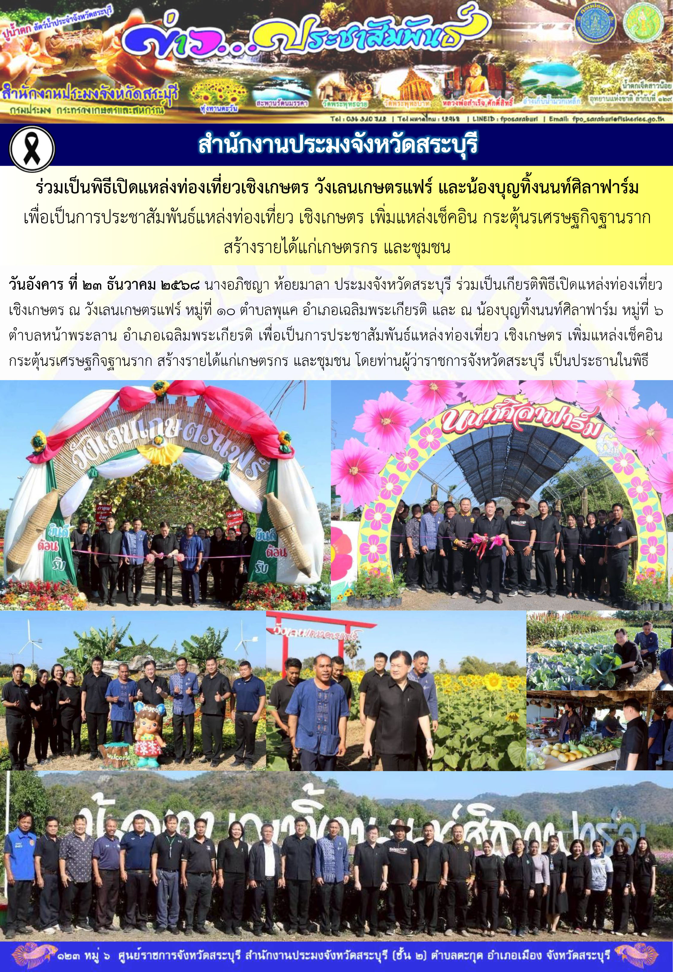 วันอังคาร ที่ 23 ธันวาคม 2568 นางอภิชญา ห้อยมาลา ประมงจังหวัดสระบุรี ร่วมเป็นเกียรติพิธีเปิดแหล่งท่องเที่ยว เชิงเกษตร ณ วังเลนเกษตรแฟร์ หมู่ที่ 10 ตำบลพุแค อำเภอเฉลิมพระเกียรติ และ ณ น้องบุญทิ้งนนท์ศิลาฟาร์ม หมู่ที่ 6 ตำบลหน้าพระลาน อำเภอเฉลิมพระเกียรติ เพื่อเป็นการประชาสัมพันธ์แหล่งท่องเที่ยว เชิงเกษตร เพิ่มแหล่งเช็คอิน กระตุ้นรเศรษฐกิจฐานราก สร้างรายได้แก่เกษตรกร และชุมชน โดยท่านผู้ว่าราชการจังหวัดสระบุรี เป็นประธานในพิธี