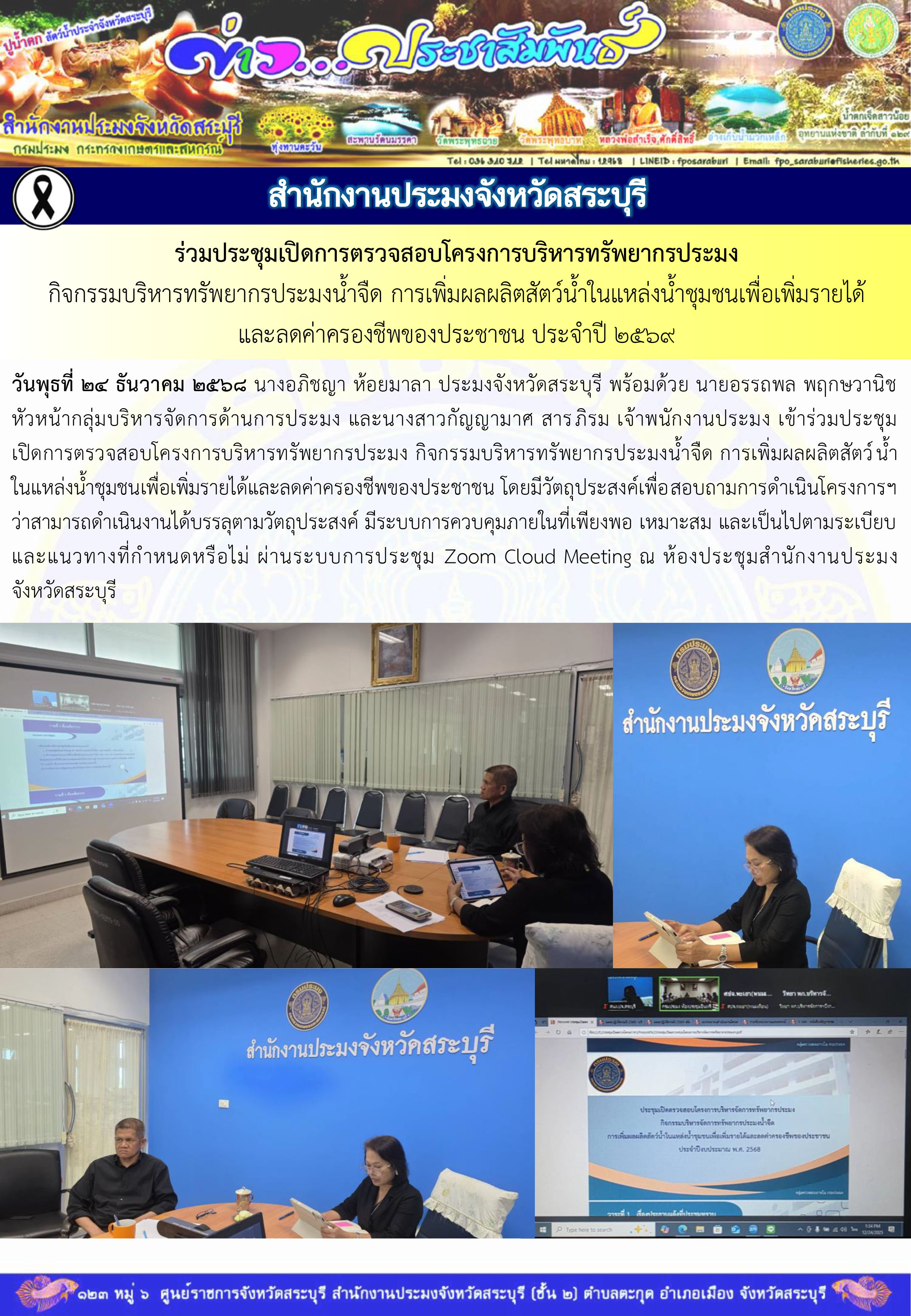 วันพุธที่ 24 ธันวาคม 2568 นางอภิชญา ห้อยมาลา ประมงจังหวัดสระบุรี พร้อมด้วย นายอรรถพล พฤกษวานิช หัวหน้ากลุ่มบริหารจัดการด้านการประมง และนางสาวกัญญามาศ สารภิรม เจ้าพนักงานประมง เข้าร่วมประชุม เปิดการตรวจสอบโครงการบริหารทรัพยากรประมง กิจกรรมบริหารทรัพยากรประมงน้ำจืด การเพิ่มผลผลิตสัตว์น้ำ ในแหล่งน้ำชุมชนเพื่อเพิ่มรายได้และลดค่าครองชีพของประชาชน โดยมีวัตถุประสงค์เพื่อสอบถามการดำเนินโครงการฯ ว่าสามารถดำเนินงานได้บรรลุตามวัตถุประสงค์ มีระบบการควบคุมภายในที่เพียงพอ เหมาะสม และเป็นไปตามระเบียบและแนวทางที่กำหนดหรือไม่ ผ่านระบบการประชุม Zoom Cloud Meeting ณ ห้องประชุมสำนักงานประมง จังหวัดสระบุรี