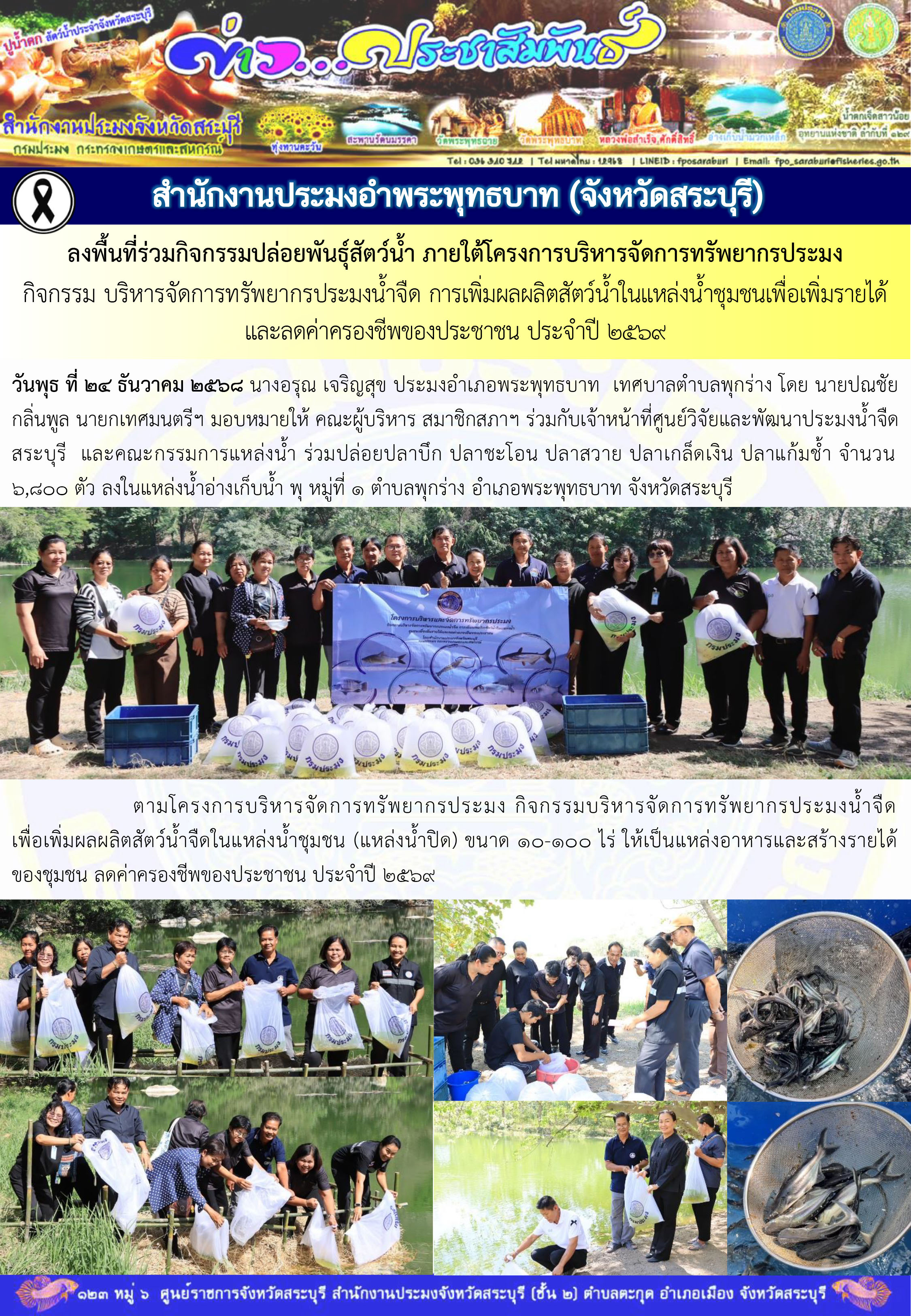 สำนักงานประมงอำเภอพระพุทธบาท ลงพื้นที่ร่วมกิจกรรมปล่อยพันธุ์สัตว์น้ำ ภายใต้โครงการบริหารจัดการทรัพยากรประมง กิจกรรม บริหารจัดการทรัพยากรประมงน้ำจืด การเพิ่มผลผลิตสัตว์น้ำในแหล่งน้ำชุมชนเพื่อเพิ่มรายได้และลดค่าครองชีพของประชาชน ประจำปี 2569