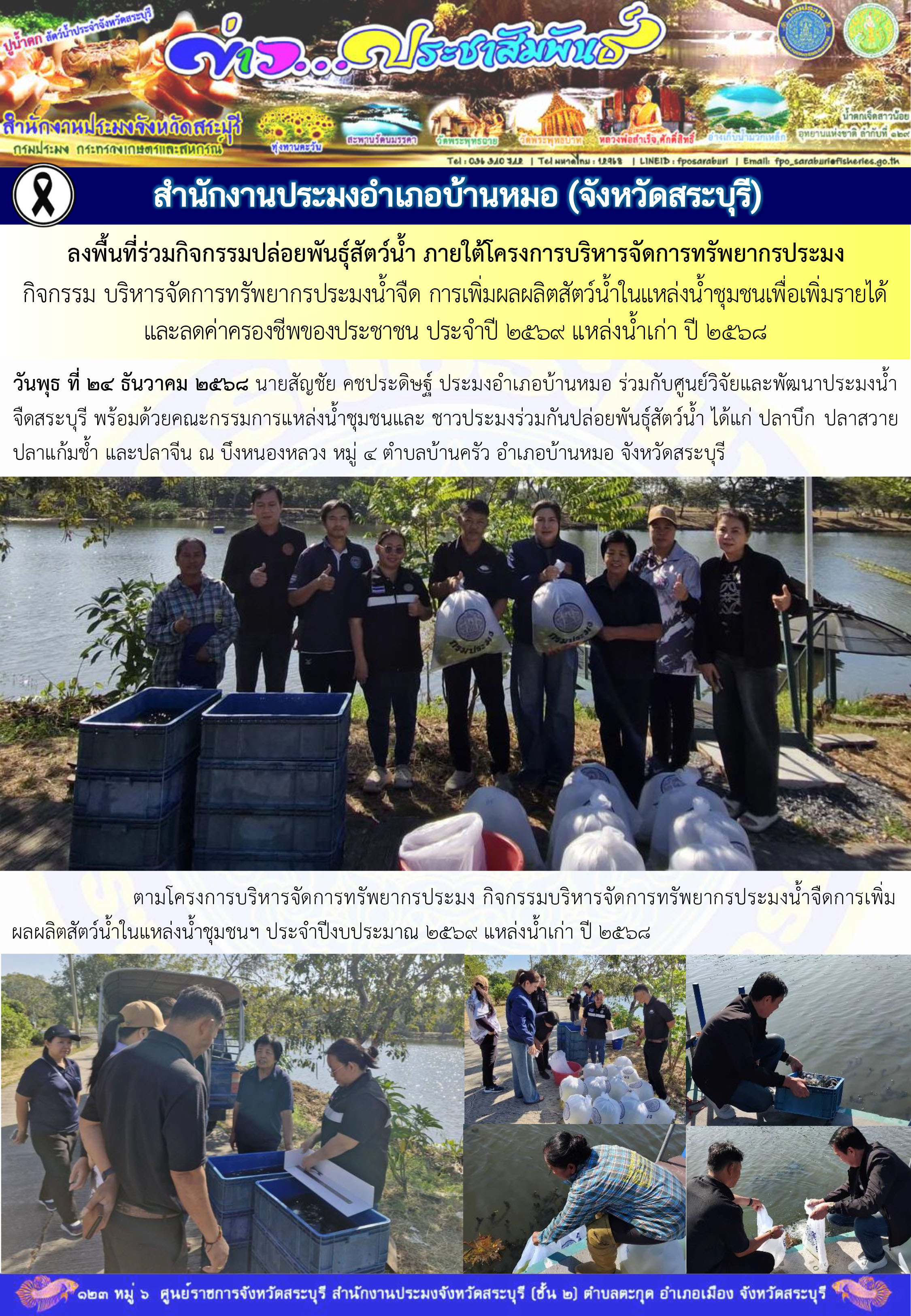 ภารกิจประจำวันที่ 24 ธันวาคม 2568 สำนักงานประมงจังหวัดสระบุรี