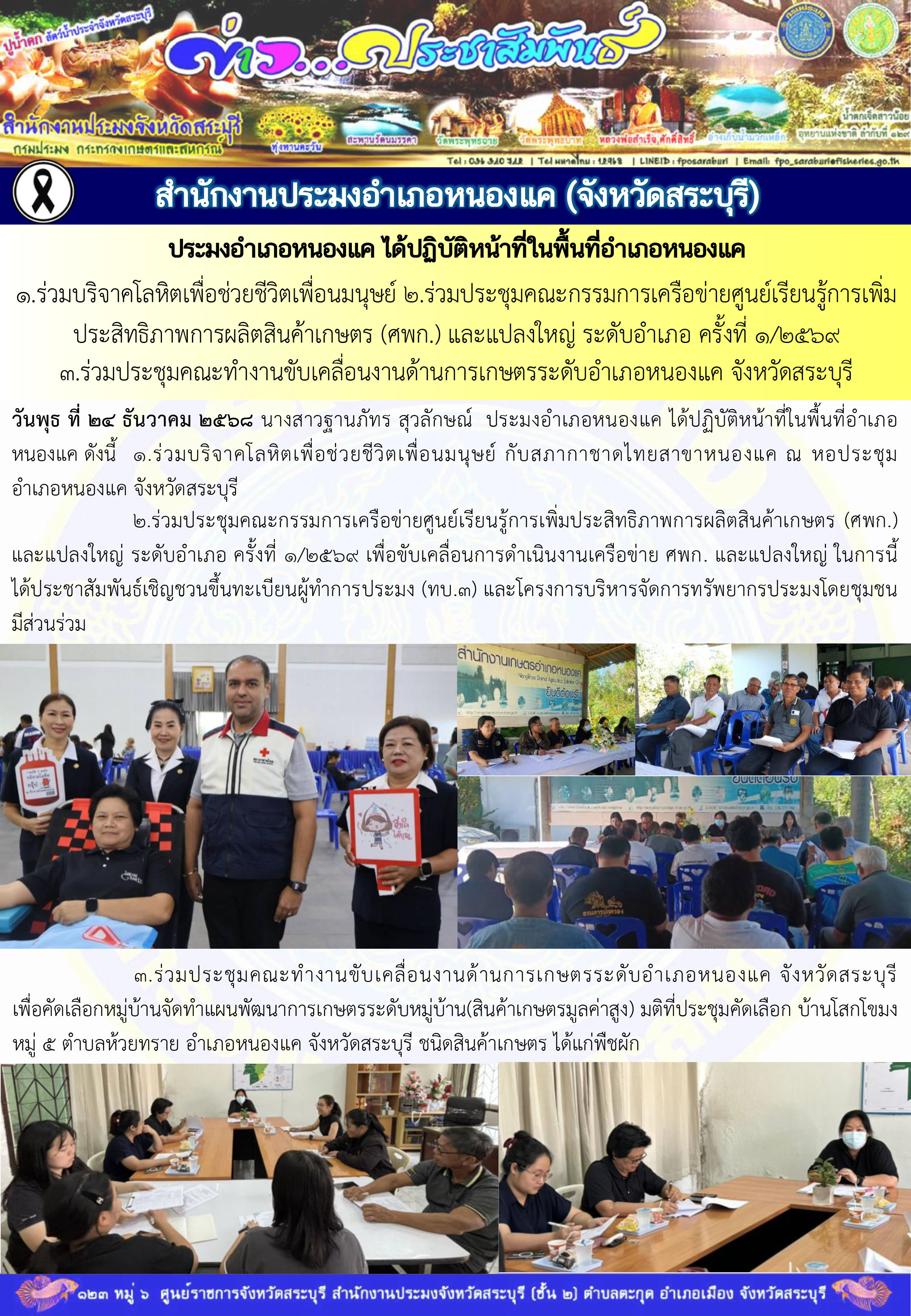 วันพุธ ที่ 24 ธันวาคม 2568 นางสาวฐานภัทร สุวลักษณ์  ประมงอำเภอหนองแค ได้ปฏิบัติหน้าที่ในพื้นที่อำเภอหนองแค ดังนี้     1.ร่วมบริจาคโลหิตเพื่อช่วยชีวิตเพื่อนมนุษย์ กับสภากาชาดไทยสาขาหนองแค ณ หอประชุมอำเภอหนองแค จังหวัดสระบุรี 2.ร่วมประชุมคณะกรรมการเครือข่ายศูนย์เรียนรู้การเพิ่มประสิทธิภาพการผลิตสินค้าเกษตร (ศพก.) และแปลงใหญ่ ระดับอำเภอ ครั้งที่ 1/2569 เพื่อขับเคลื่อนการดำเนินงานเครือข่าย ศพก. และแปลงใหญ่ ในการนี้ได้ประชาสัมพันธ์เชิญชวนขึ้นทะเบียนผู้ทำการประมง (ทบ.3) และโครงการบริหารจัดการทรัพยากรประมงโดยชุมชนมีส่วนร่วม 3.ร่วมประชุมคณะทำงานขับเคลื่อนงานด้านการเกษตรระดับอำเภอหนองแค จังหวัดสระบุรี เพื่อคัดเลือกหมู่บ้านจัดทำแผนพัฒนาการเกษตรระดับหมู่บ้าน(สินค้าเกษตรมูลค่าสูง) มติที่ประชุมคัดเลือก บ้านโสกโขมง หมู่ 5 ตำบลห้วยทราย อำเภอหนองแค จังหวัดสระบุรี ชนิดสินค้าเกษตร ได้แก่พืชผัก