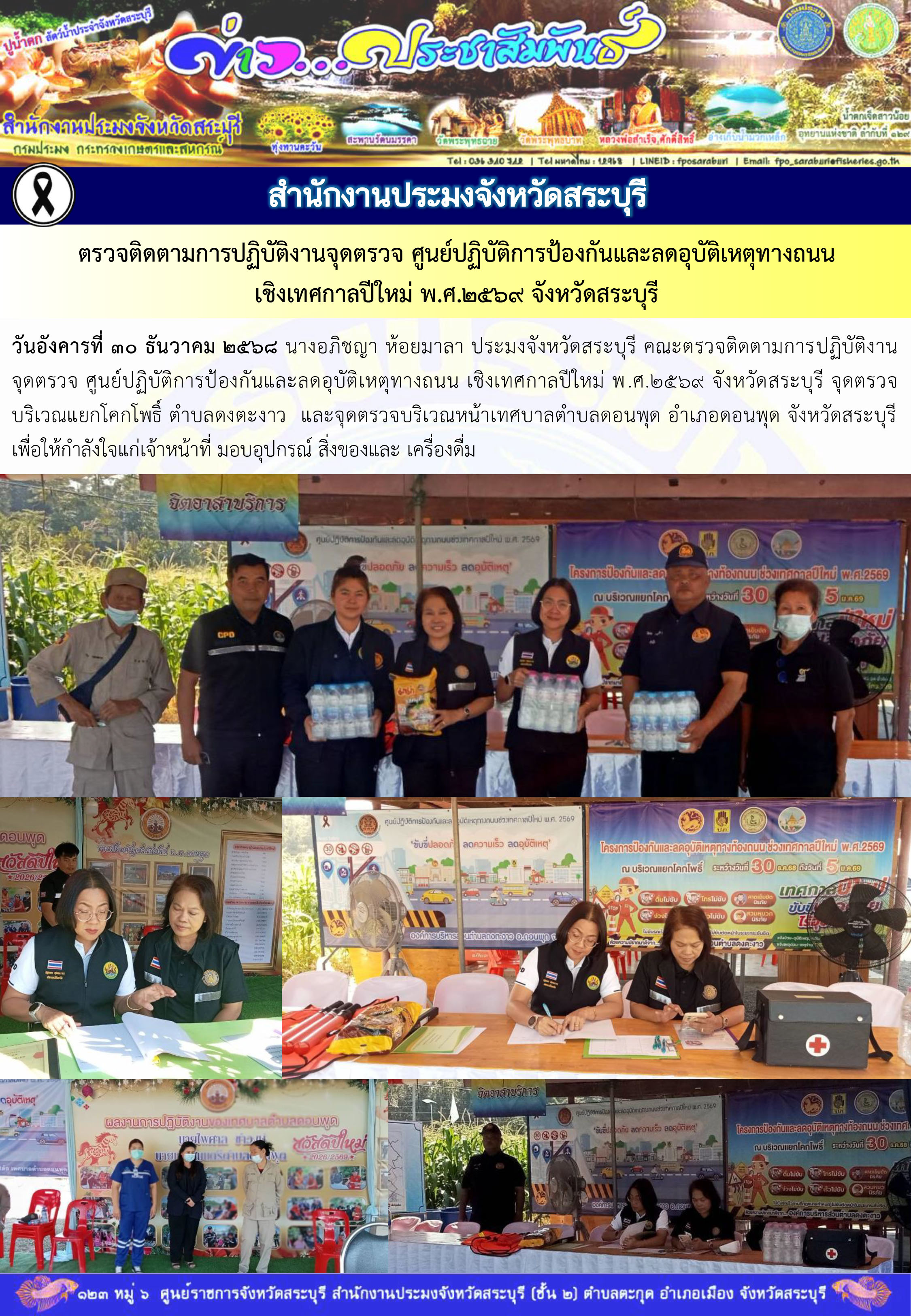 สำนักงานประมงจังหวัดสระบุรี ตรวจติดตามการปฏิบัติงานจุดตรวจ ศูนย์ปฏิบัติการป้องกันและลดอุบัติเหตุทางถนน เชิงเทศกาลปีใหม่ พ.ศ.2569