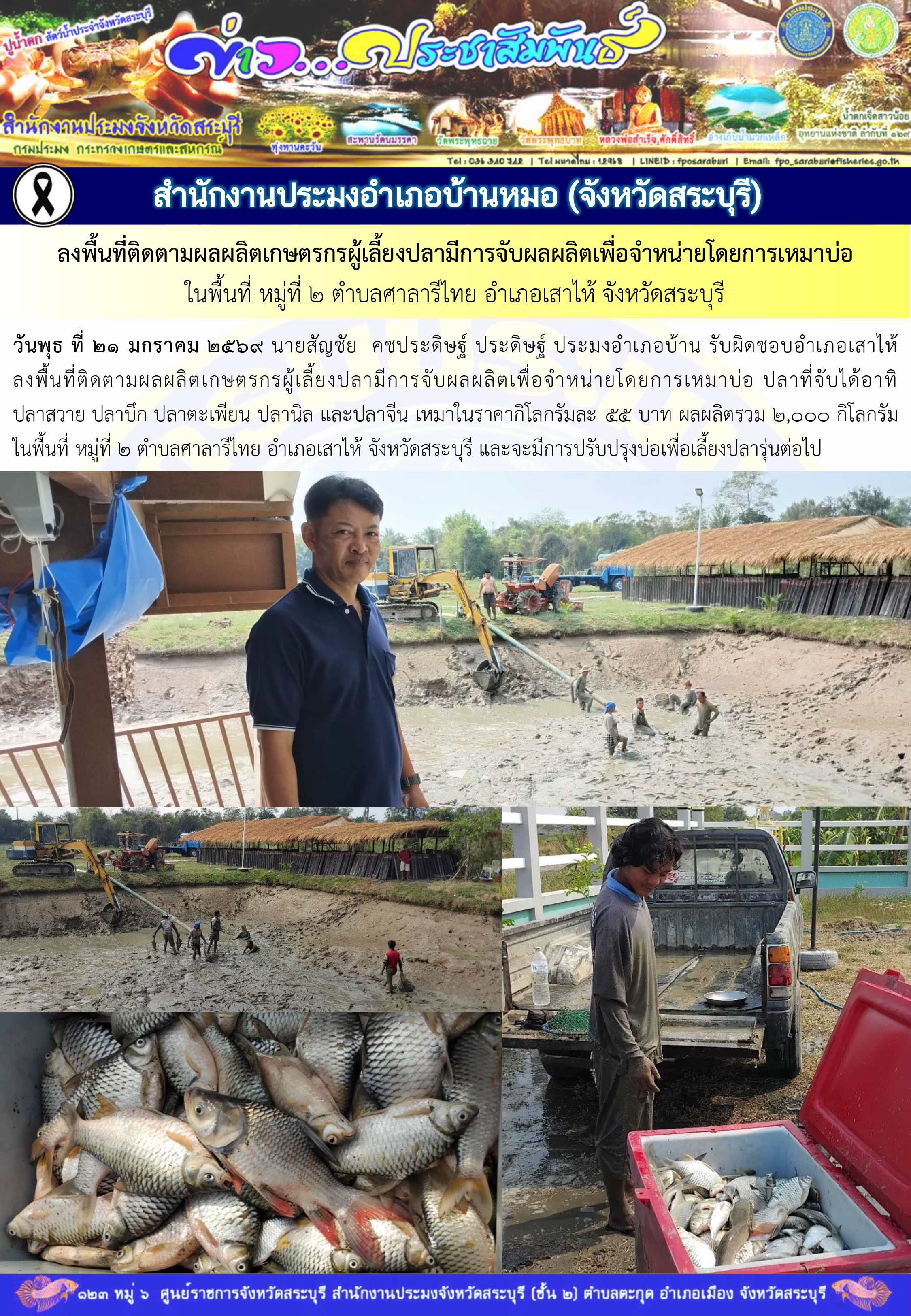 สำนักงานประมงอำเภอบ้านหมอ ลงพื้นที่ติดตามผลผลิตเกษตรกรผู้เลี้ยงปลามีการจับผลผลิตเพื่อจำหน่ายโดยการเหมาบ่อในพื้นที่ หมู่ที่ 2 ตำบลศาลารีไทย อำเภอเสาไห้ จังหวัดสระบุรี