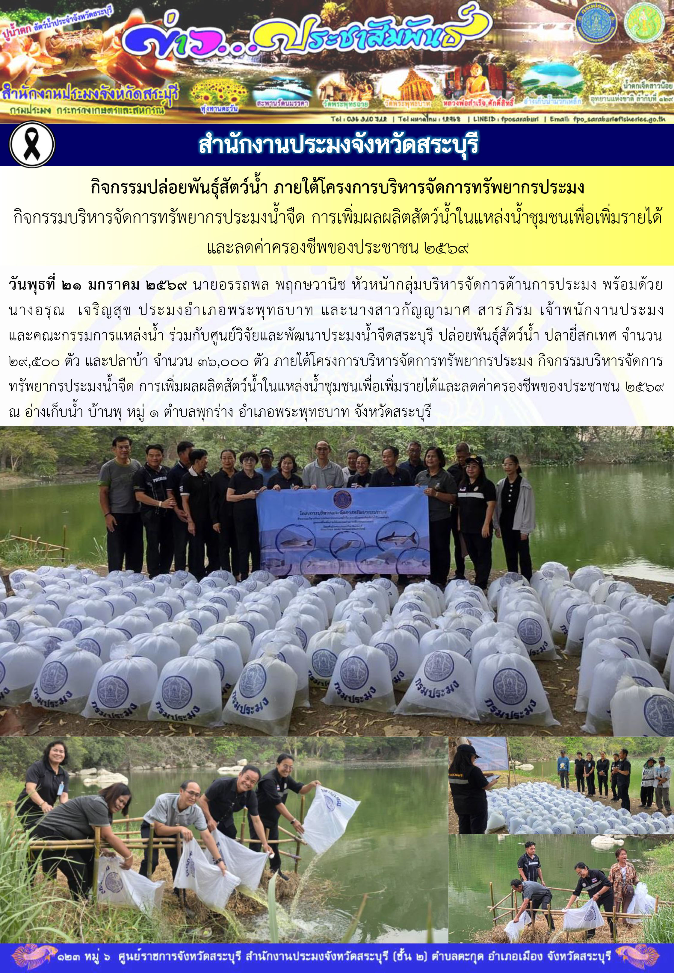 สำนักงานประมงจังหวัดสระบุรี กิจกรรมปล่อยพันธุ์สัตว์น้ำ ภายใต้โครงการบริหารจัดการทรัพยากรประมง กิจกรรมบริหารจัดการทรัพยากรประมงน้ำจืด การเพิ่มผลผลิตสัตว์น้ำในแหล่งน้ำชุมชนเพื่อเพิ่มรายได้และลดค่าครองชีพของประชาชน 2569