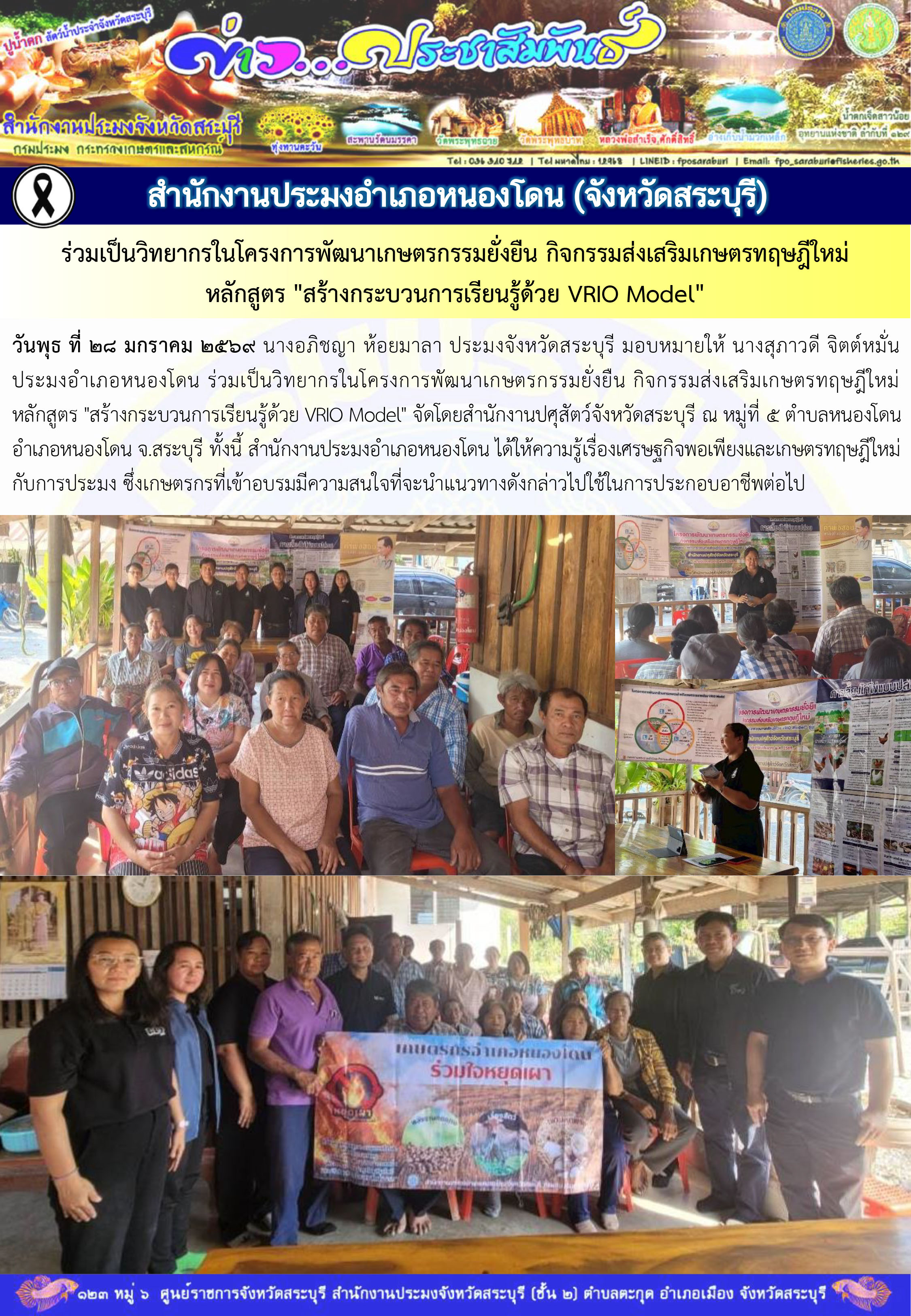 วันพุธ ที่ 28 มกราคม 2569 นางอภิชญา ห้อยมาลา ประมงจังหวัดสระบุรี มอบหมายให้ นางสุภาวดี จิตต์หมั่น ประมงอำเภอหนองโดน ร่วมเป็นวิทยากรในโครงการพัฒนาเกษตรกรรมยั่งยืน กิจกรรมส่งเสริมเกษตรทฤษฎีใหม่ หลักสูตร "สร้างกระบวนการเรียนรู้ด้วย VRIO Model" จัดโดยสำนักงานปศุสัตว์จังหวัดสระบุรี ณ หมู่ที่ 5 ตำบลหนองโดน อำเภอหนองโดน จ.สระบุรี ทั้งนี้ สำนักงานประมงอำเภอหนองโดน ได้ให้ความรู้เรื่องเศรษฐกิจพอเพียงและเกษตรทฤษฎีใหม่กับการประมง ซึ่งเกษตรกรที่เข้าอบรมมีความสนใจที่จะนำแนวทางดังกล่าวไปใช้ในการประกอบอาชีพต่อไป