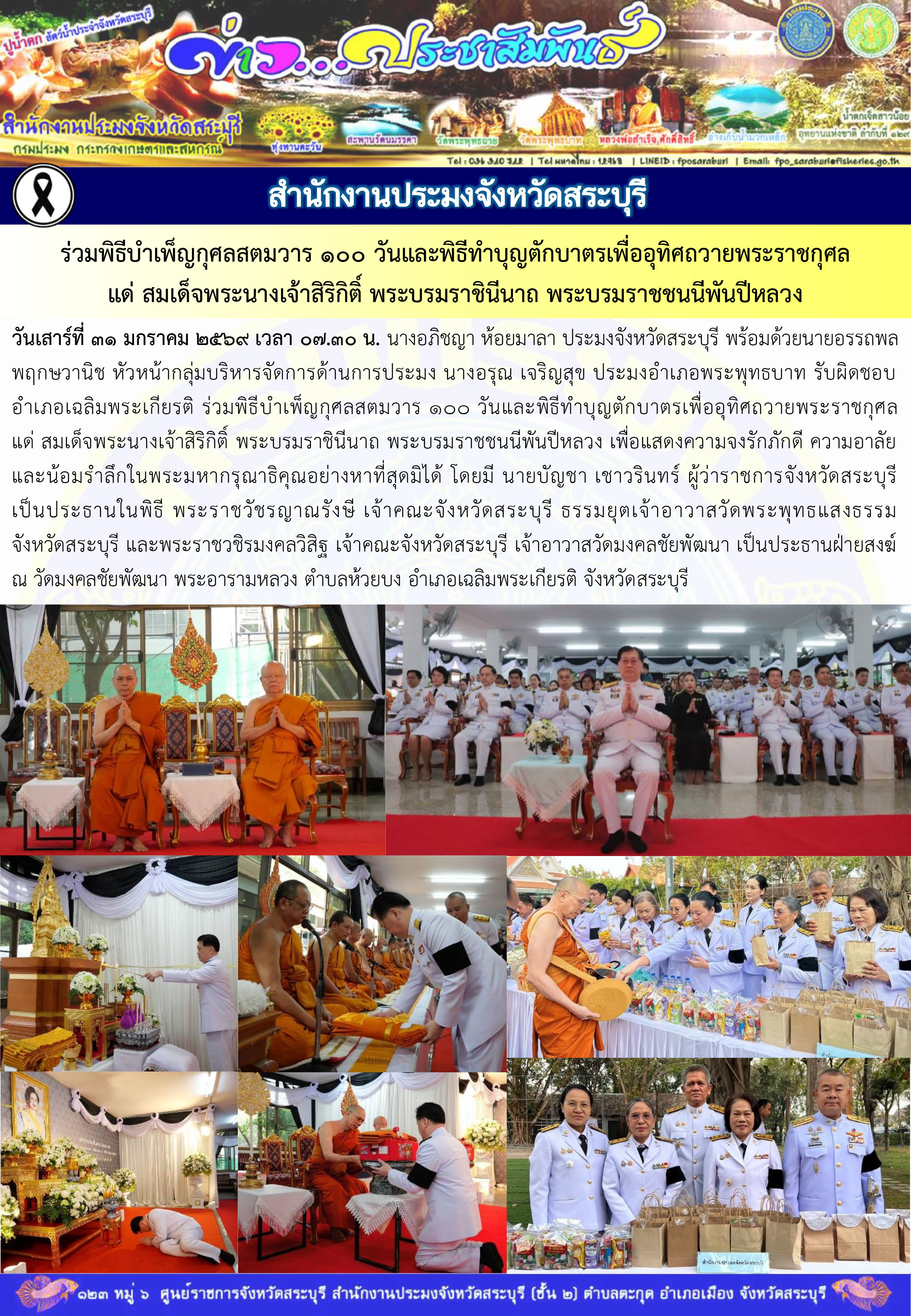 สำนักงานประมงจังหวัดสระบุรี ร่วมพิธีบำเพ็ญกุศลสตมวาร 100 วันและพิธีทำบุญตักบาตรเพื่ออุทิศถวายพระราชกุศล แด่ สมเด็จพระนางเจ้าสิริกิติ์ พระบรมราชินีนาถ พระบรมราชชนนีพันปีหลวง