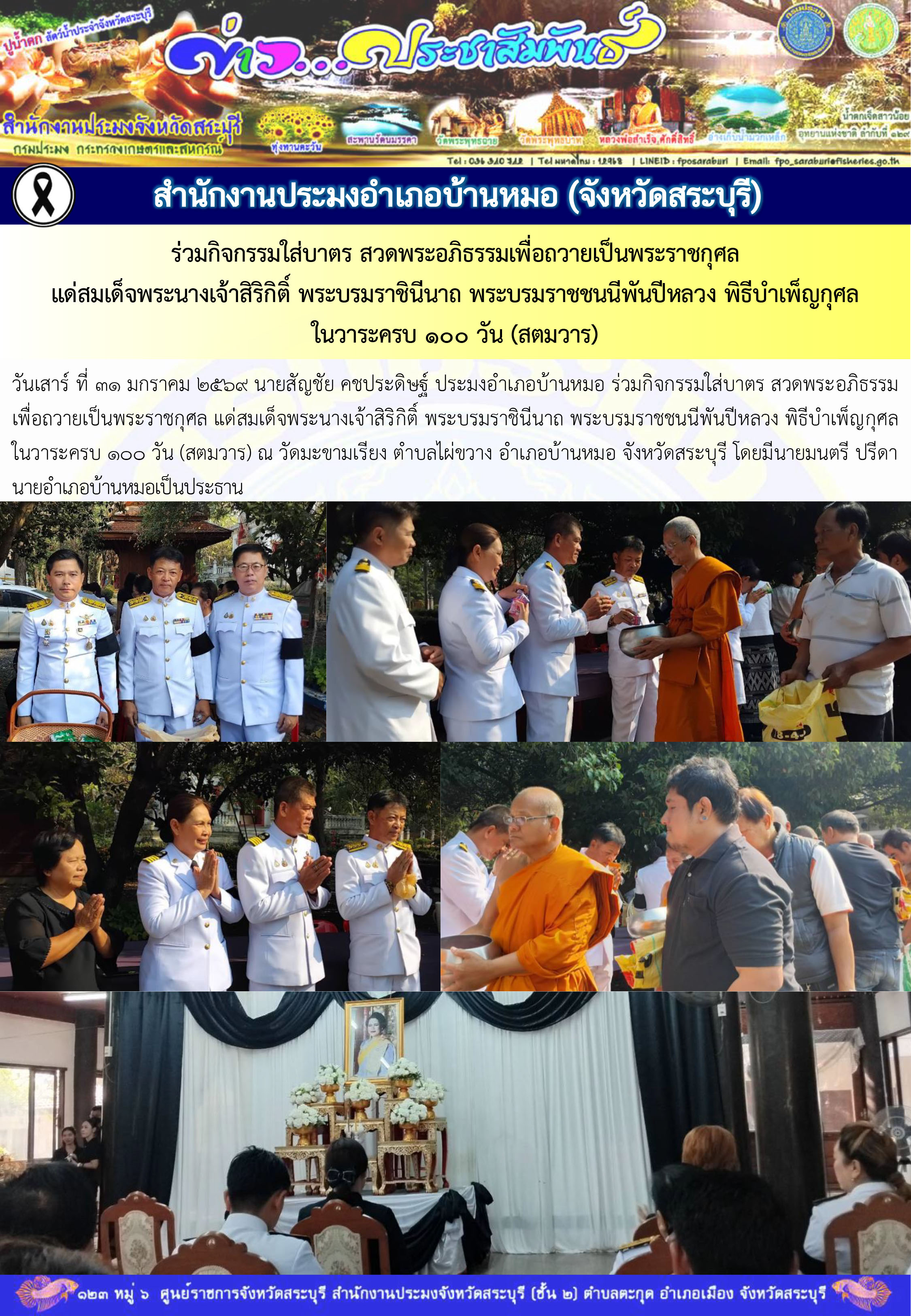 สำนักงานประมงอำเภอบ้านหมอ ร่วมกิจกรรมใส่บาตร สวดพระอภิธรรมเพื่อถวายเป็นพระราชกุศล แด่สมเด็จพระนางเจ้าสิริกิติ์ พระบรมราชินีนาถ พระบรมราชชนนีพันปีหลวง พิธีบำเพ็ญกุศล ในวาระครบ 100 วัน (สตมวาร)