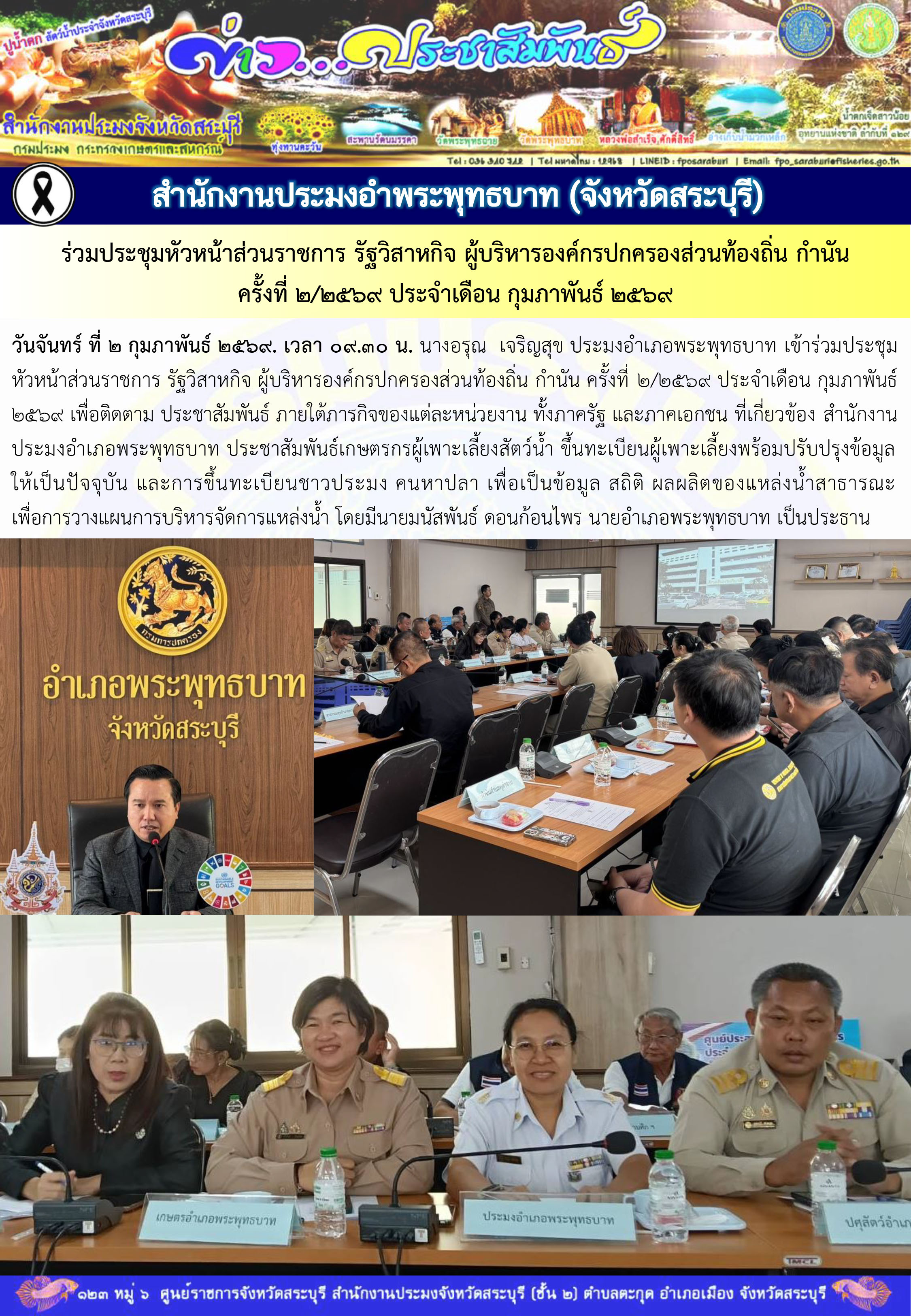 วันจันทร์ ที่ 2 กุมภาพันธ์ 2569. เวลา 09.30 น. นางอรุณ  เจริญสุข ประมงอำเภอพระพุทธบาท เข้าร่วมประชุมหัวหน้าส่วนราชการ รัฐวิสาหกิจ ผู้บริหารองค์กรปกครองส่วนท้องถิ่น กำนัน ครั้งที่ 2/2569 ประจำเดือน กุมภาพันธ์ 2569 เพื่อติดตาม ประชาสัมพันธ์ ภายใต้ภารกิจของแต่ละหน่วยงาน ทั้งภาครัฐ และภาคเอกชน ที่เกี่ยวข้อง สำนักงานประมงอำเภอพระพุทธบาท ประชาสัมพันธ์เกษตรกรผู้เพาะเลี้ยงสัตว์น้ำ ขึ้นทะเบียนผู้เพาะเลี้ยงพร้อมปรับปรุงข้อมูล ให้เป็นปัจจุบัน และการขึ้นทะเบียนชาวประมง คนหาปลา เพื่อเป็นข้อมูล สถิติ ผลผลิตของแหล่งน้ำสาธารณะ เพื่อการวางแผนการบริหารจัดการแหล่งน้ำ โดยมีนายมนัสพันธ์ ดอนก้อนไพร นายอำเภอพระพุทธบาท เป็นประธาน