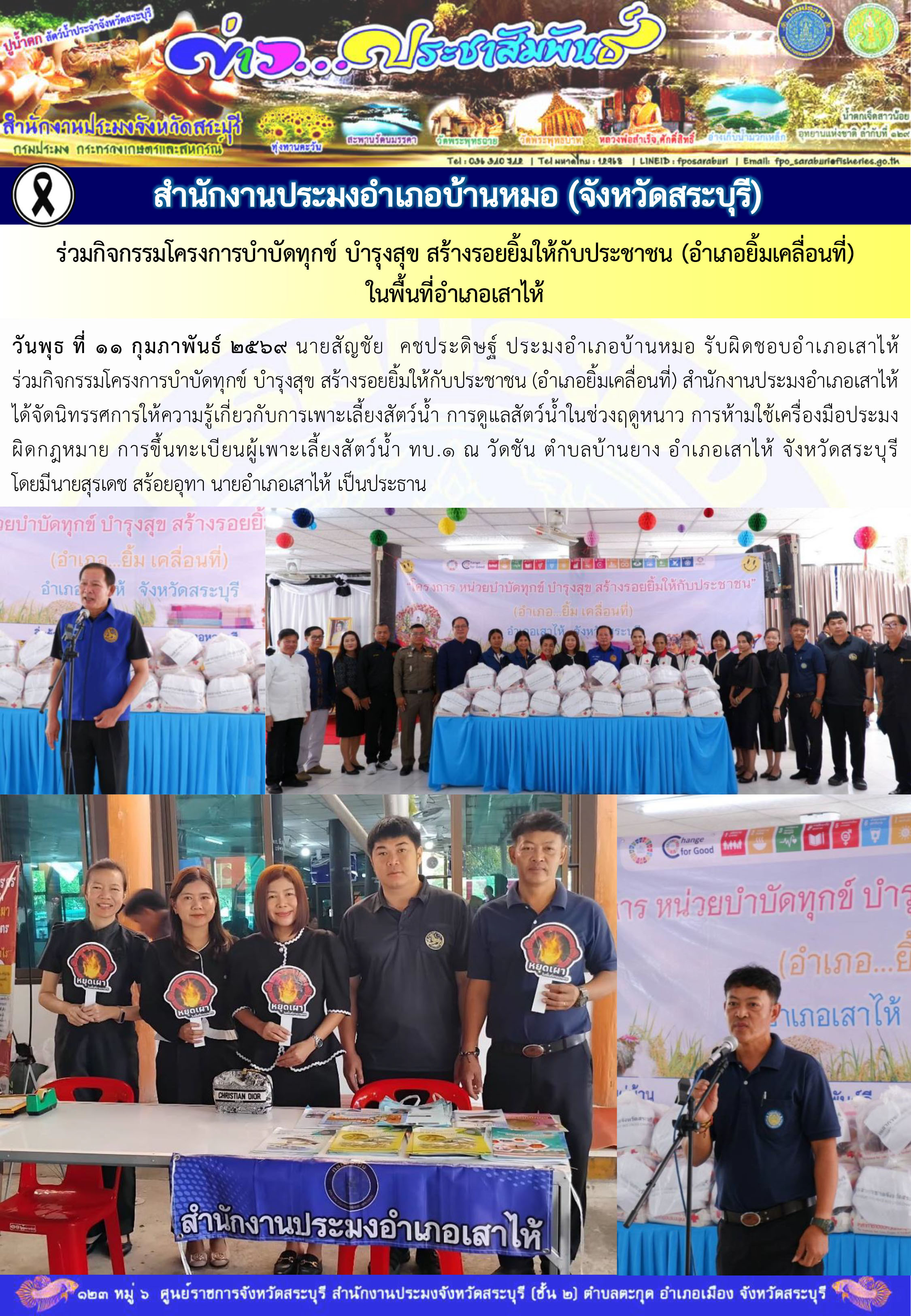 สำนักงานประมงอำเภอบ้านหมอ ร่วมกิจกรรมโครงการบำบัดทุกข์ บำรุงสุข สร้างรอยยิ้มให้กับประชาชน (อำเภอยิ้มเคลื่อนที่) ในพื้นที่อำเภอเสาไห้