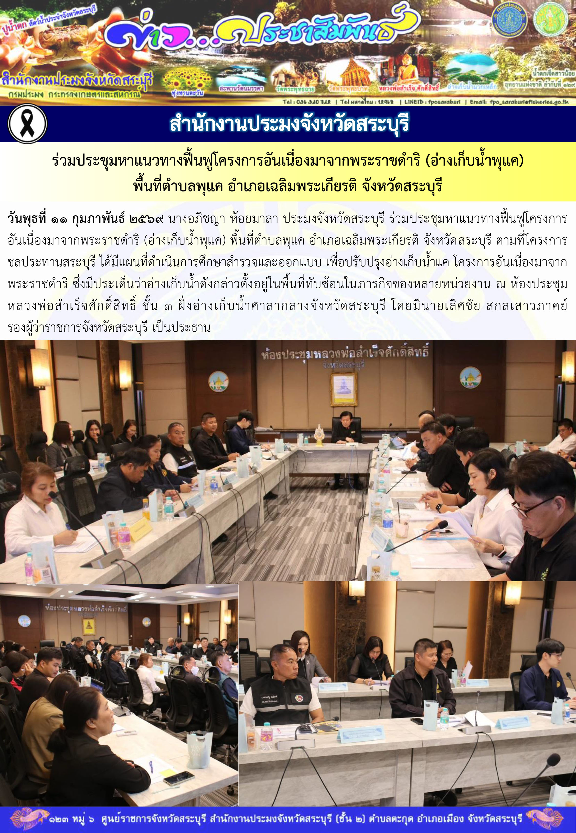 วันพุธที่ 11 กุมภาพันธ์ 2569 นางอภิชญา ห้อยมาลา ประมงจังหวัดสระบุรี ร่วมประชุมหาแนวทางฟื้นฟูโครงการ อันเนื่องมาจากพระราชดำริ (อ่างเก็บน้ำพุแค) พื้นที่ตำบลพุแค อำเภอเฉลิมพระเกียรติ จังหวัดสระบุรี ตามที่โครงการชลประทานสระบุรี ได้มีแผนที่ดำเนินการศึกษาสำรวจและออกแบบ เพื่อปรับปรุงอ่างเก็บน้ำแค โครงการอันเนื่องมาจากพระราชดำริ ซึ่งมีประเด็นว่าอ่างเก็บน้ำดังกล่าวตั้งอยู่ในพื้นที่ทับซ้อนในภารกิจของหลายหน่วยงาน ณ ห้องประชุม หลวงพ่อสำเร็จศักดิ์สิทธิ์ ชั้น 3 ฝั่งอ่างเก็บน้ำศาลากลางจังหวัดสระบุรี โดยมีนายเลิศชัย สกลเสาวภาคย์ รองผู้ว่าราชการจังหวัดสระบุรี เป็นประธาน