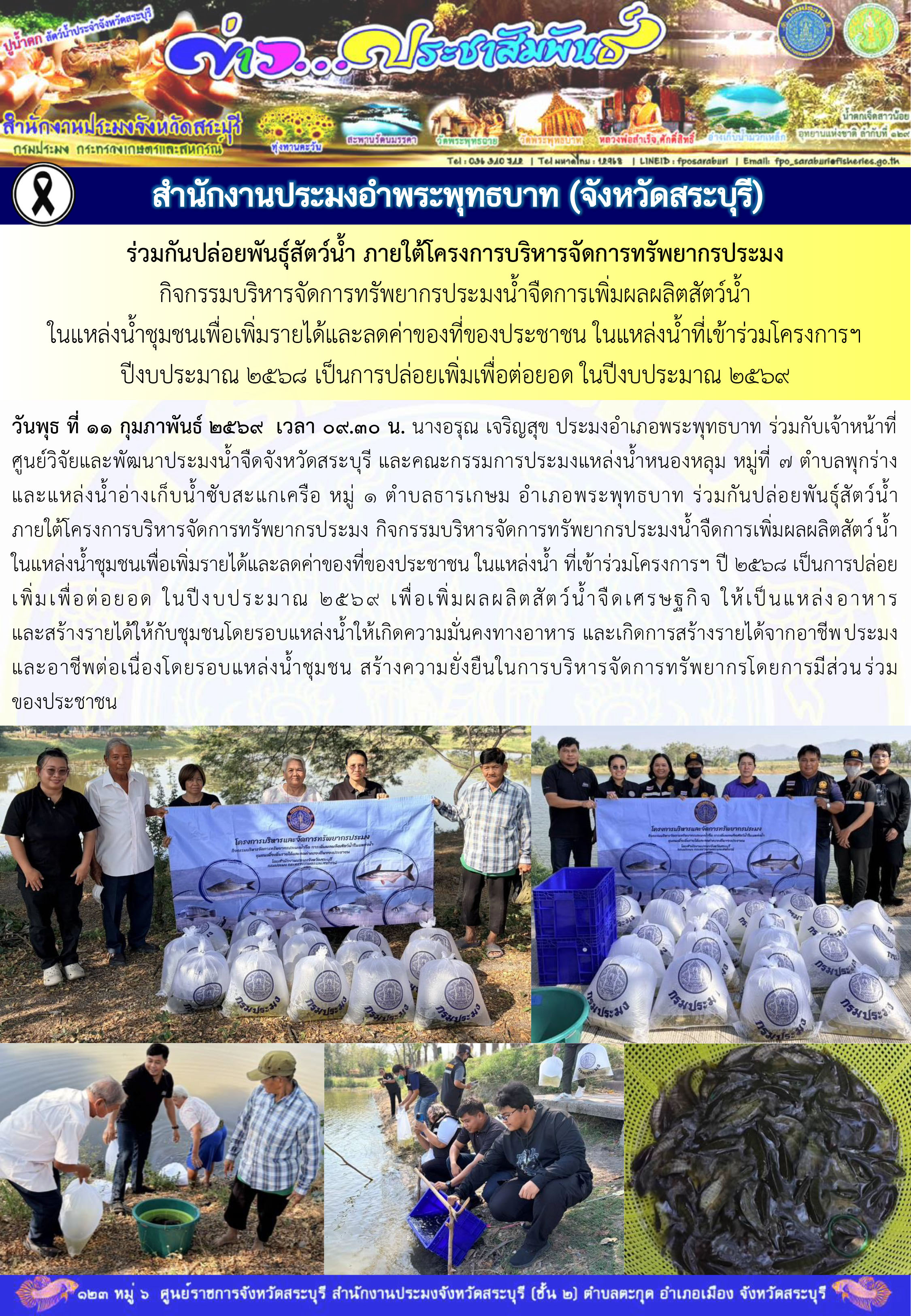สำนักงานประมงอำเภอพระพุทธบาท ร่วมกันปล่อยพันธุ์สัตว์น้ำ ภายใต้โครงการบริหารจัดการทรัพยากรประมง กิจกรรมบริหารจัดการทรัพยากรประมงน้ำจืดการเพิ่มผลผลิตสัตว์น้ำ ในแหล่งน้ำชุมชนเพื่อเพิ่มรายได้และลดค่าของที่ของประชาชน ในแหล่งน้ำที่เข้าร่วมโครงการฯ ปีงบประมาณ 2568 เป็นการปล่อยเพิ่มเพื่อต่อยอด ในปีงบประมาณ 2569