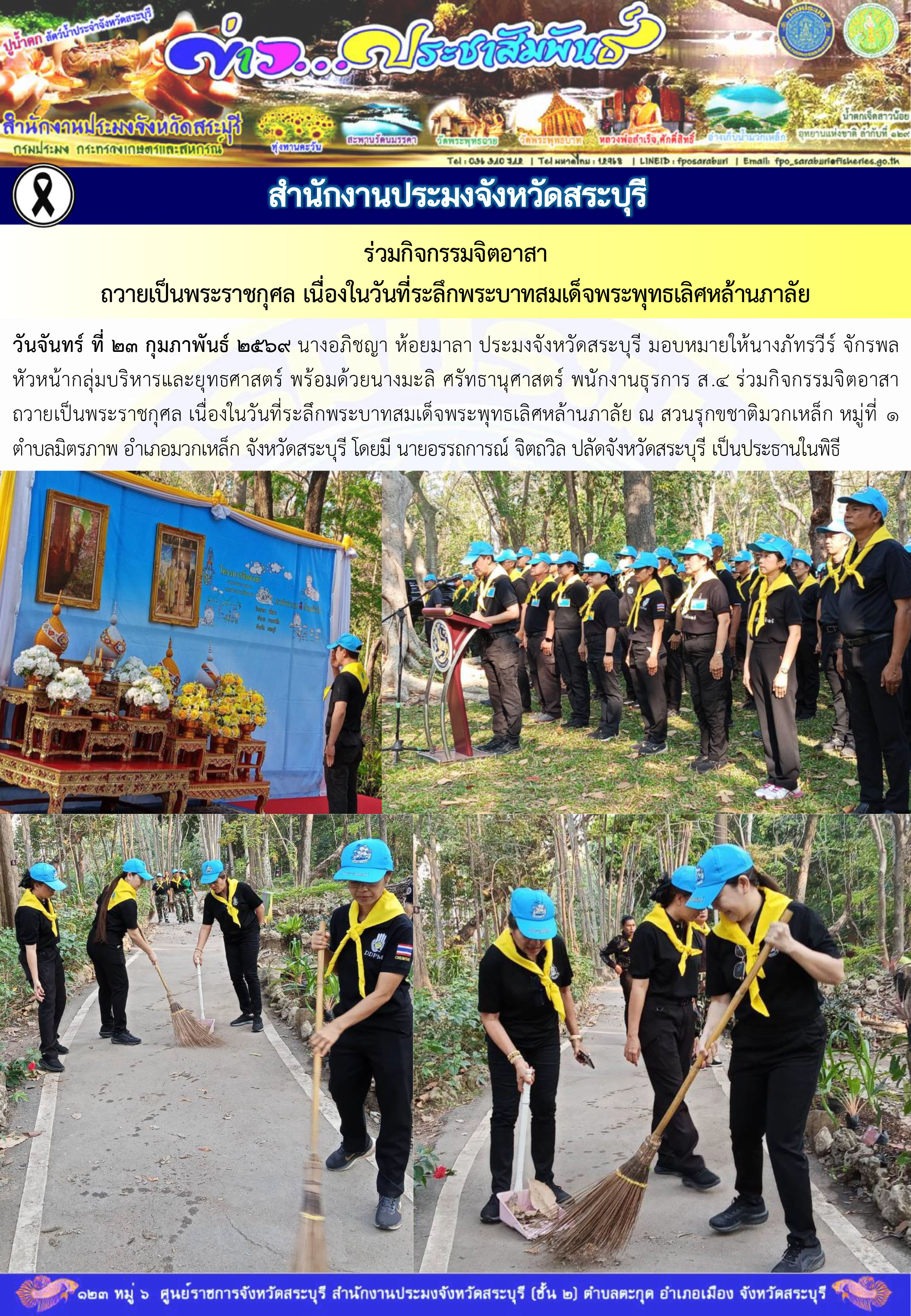 วันจันทร์ ที่ 23 กุมภาพันธ์ 2569 นางอภิชญา ห้อยมาลา ประมงจังหวัดสระบุรี มอบหมายให้นางภัทรวีร์ จักรพล หัวหน้ากลุ่มบริหารและยุทธศาสตร์ พร้อมด้วยนางมะลิ ศรัทธานุศาสตร์ พนักงานธุรการ ส.4 ร่วมกิจกรรมจิตอาสา ถวายเป็นพระราชกุศล เนื่องในวันที่ระลึกพระบาทสมเด็จพระพุทธเลิศหล้านภาลัย ณ สวนรุกขชาติมวกเหล็ก หมู่ที่ 1 ตำบลมิตรภาพ อำเภอมวกเหล็ก จังหวัดสระบุรี โดยมี นายอรรถการณ์ จิตถวิล ปลัดจังหวัดสระบุรี เป็นประธานในพิธี