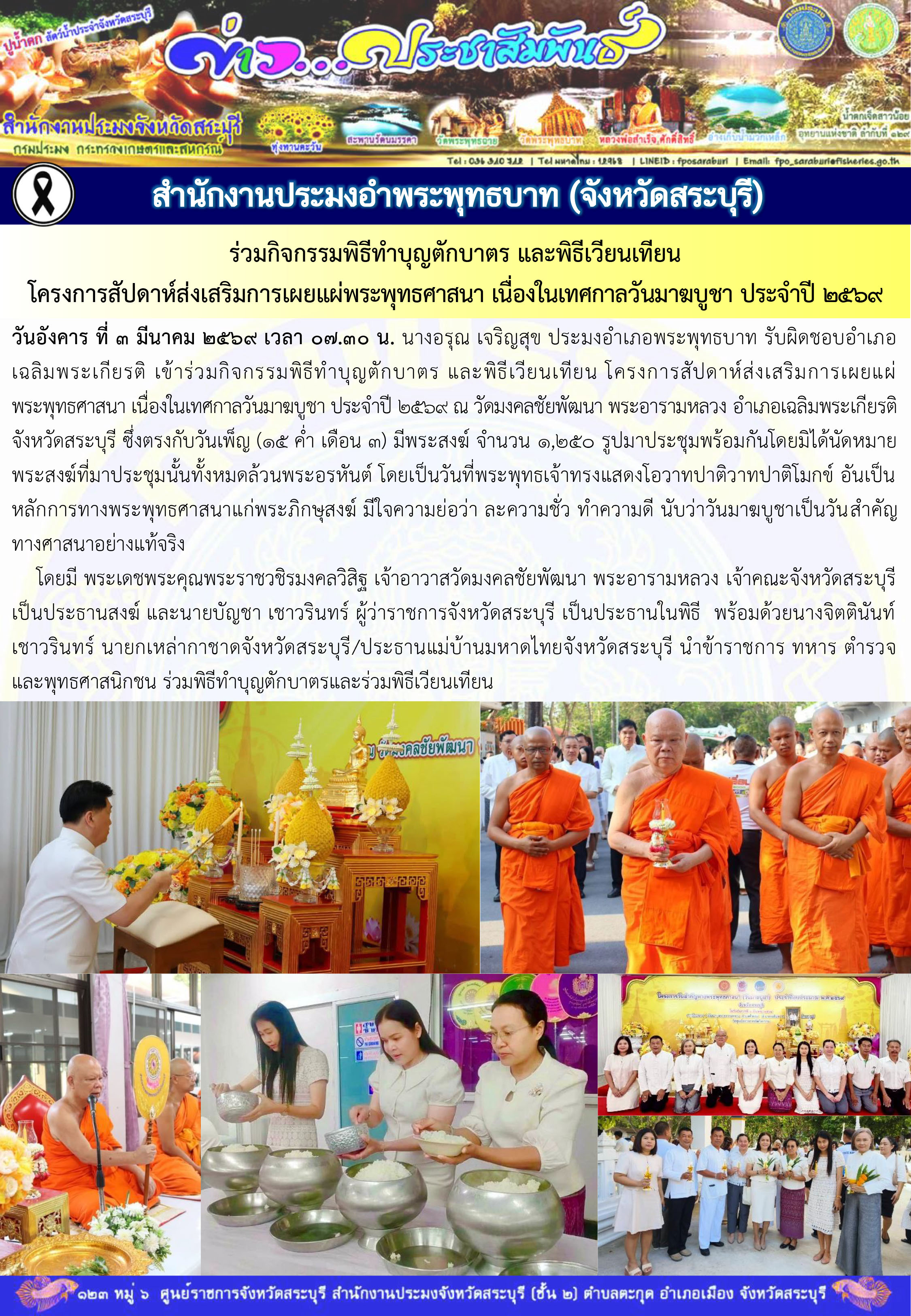 วันอังคาร ที่ ๓ มีนาคม ๒๕๖๙ เวลา ๐๗.๓๐ น. นางอรุณ เจริญสุข ประมงอำเภอพระพุทธบาท รับผิดชอบอำเภอเฉลิมพระเกียรติ เข้าร่วมกิจกรรมพิธีทำบุญตักบาตร และพิธีเวียนเทียน โครงการสัปดาห์ส่งเสริมการเผยแผ่พระพุทธศาสนา เนื่องในเทศกาลวันมาฆบูชา ประจำปี ๒๕๖๙ ณ วัดมงคลชัยพัฒนา พระอารามหลวง อำเภอเฉลิมพระเกียรติ จังหวัดสระบุรี ซึ่งตรงกับวันเพ็ญ (15 ค่ำ เดือน 3) มีพระสงฆ์ จำนวน 1,250 รูปมาประชุมพร้อมกันโดยมิได้นัดหมาย พระสงฆ์ที่มาประชุมนั้นทั้งหมดล้วนพระอรหันต์ โดยเป็นวันที่พระพุทธเจ้าทรงแสดงโอวาทปาติวาทปาติโมกข์ อันเป็นหลักการทางพระพุทธศาสนาแก่พระภิกษุสงฆ์ มีใจความย่อว่า ละความชั่ว ทำความดี นับว่าวันมาฆบูชาเป็นวันสำคัญทางศาสนาอย่างแท้จริง