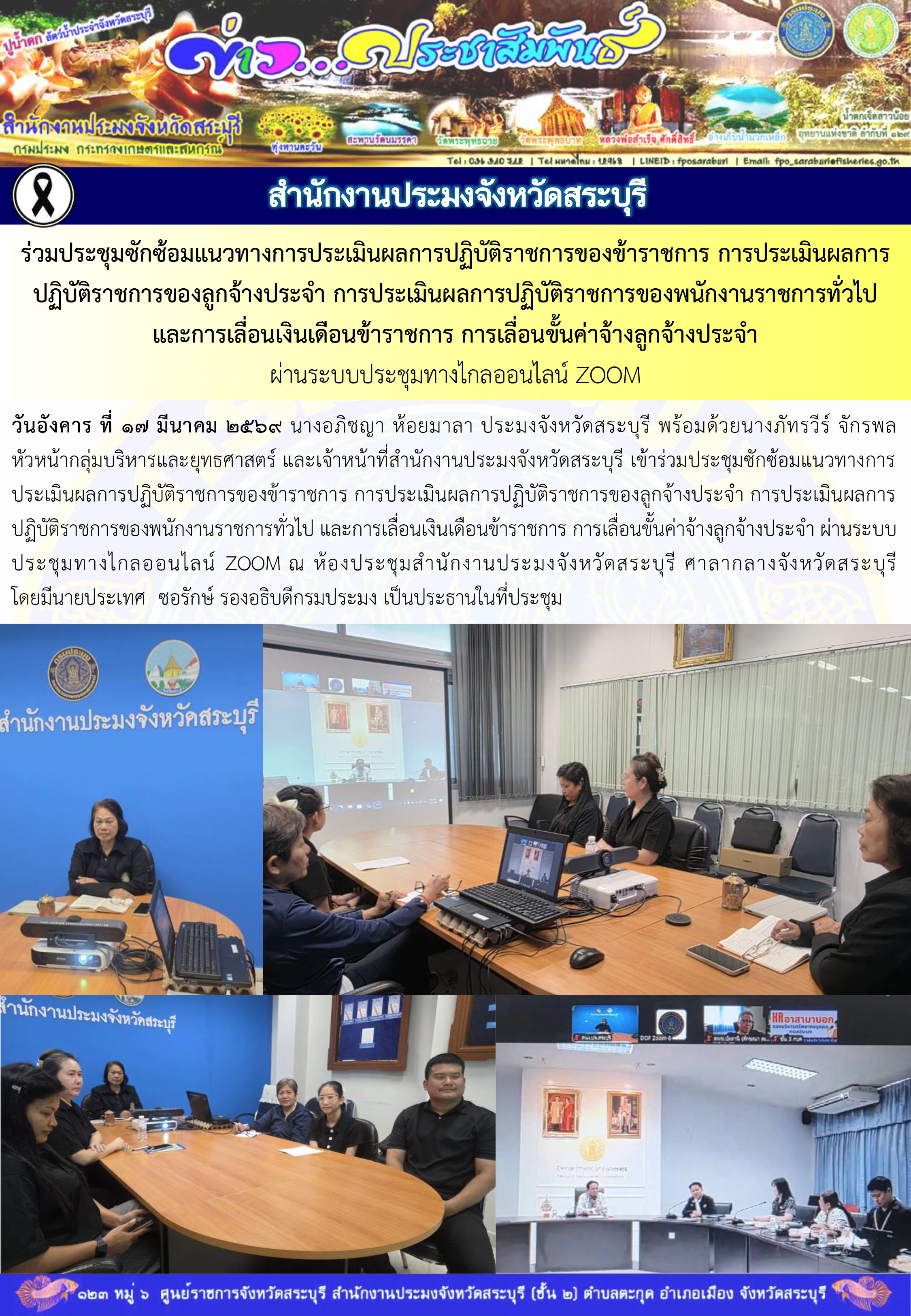 วันอังคาร ที่ 17 มีนาคม 2569 นางอภิชญา ห้อยมาลา ประมงจังหวัดสระบุรี พร้อมด้วยนางภัทรวีร์ จักรพล หัวหน้ากลุ่มบริหารและยุทธศาสตร์ และเจ้าหน้าที่สำนักงานประมงจังหวัดสระบุรี เข้าร่วมประชุมซักซ้อมแนวทางการประเมินผลการปฏิบัติราชการของข้าราชการ การประเมินผลการปฏิบัติราชการของลูกจ้างประจำ การประเมินผลการปฏิบัติราชการของพนักงานราชการทั่วไป และการเลื่อนเงินเดือนข้าราชการ การเลื่อนขั้นค่าจ้างลูกจ้างประจำ ผ่านระบบประชุมทางไกลออนไลน์ ZOOM ณ ห้องประชุมสำนักงานประมงจังหวัดสระบุรี ศาลากลางจังหวัดสระบุรี โดยมีนายประเทศ  ซอรักษ์ รองอธิบดีกรมประมง เป็นประธานในที่ประชุม