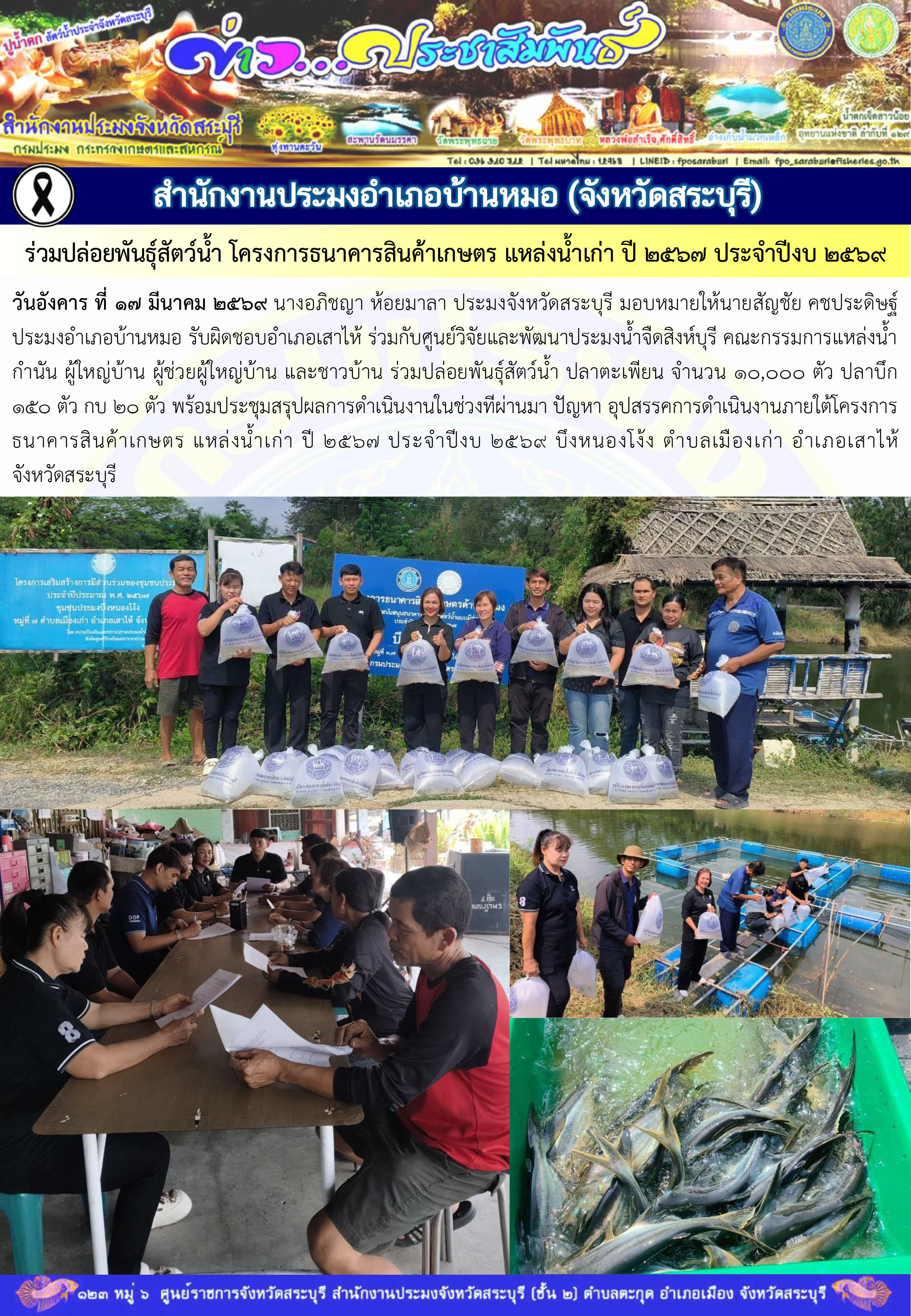 ภารกิจประจำวันที่ 17 มีนาคม 2569 สำนักงานประมงจังหวัดสระบุรี
