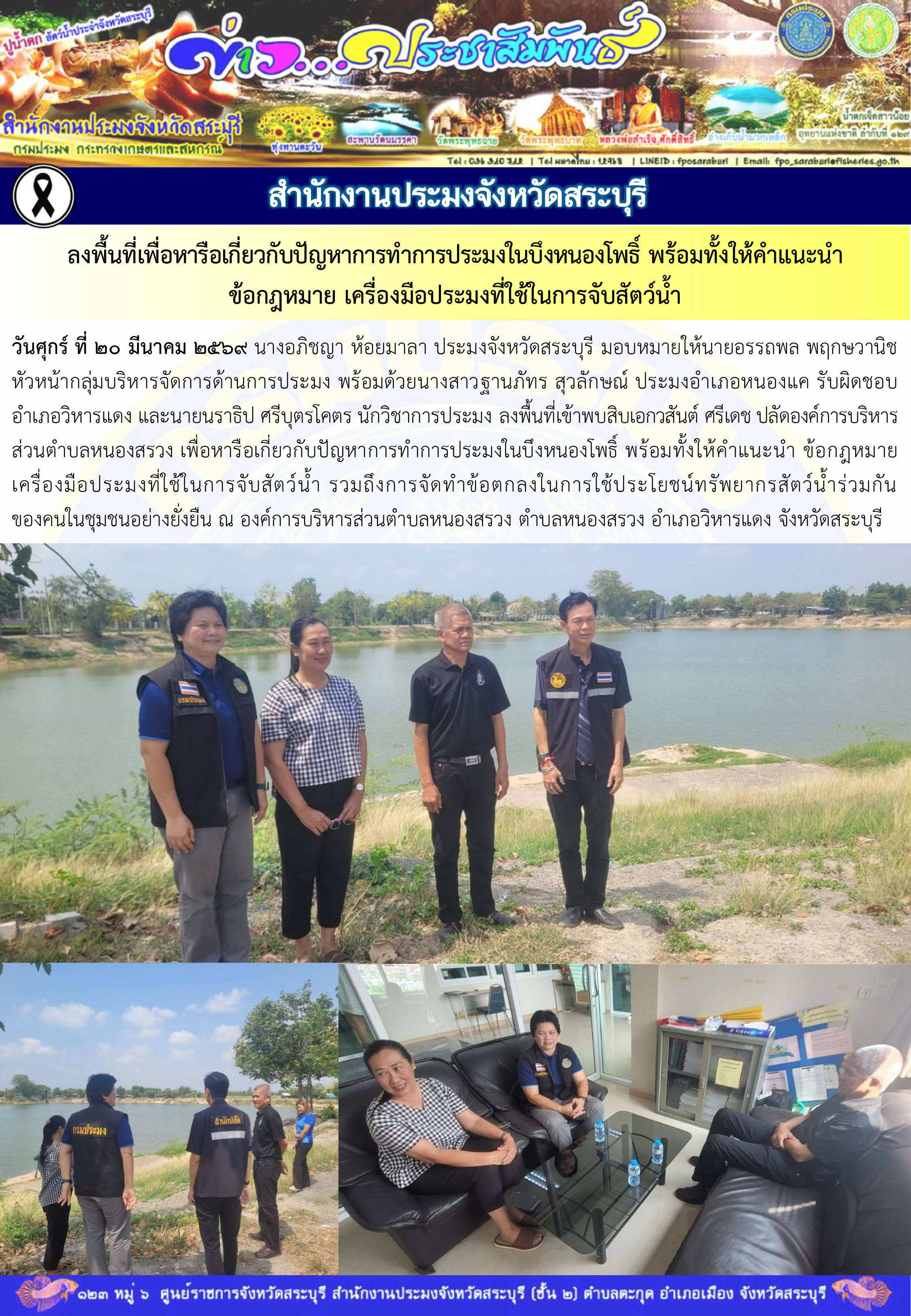 สำนักงานประมงจังหวัดสระบุรี ลงพื้นที่เพื่อหารือเกี่ยวกับปัญหาการทำการประมงในบึงหนองโพธิ์ พร้อมทั้งให้คำแนะนำ ข้อกฎหมาย เครื่องมือประมงที่ใช้ในการจับสัตว์น้ำ