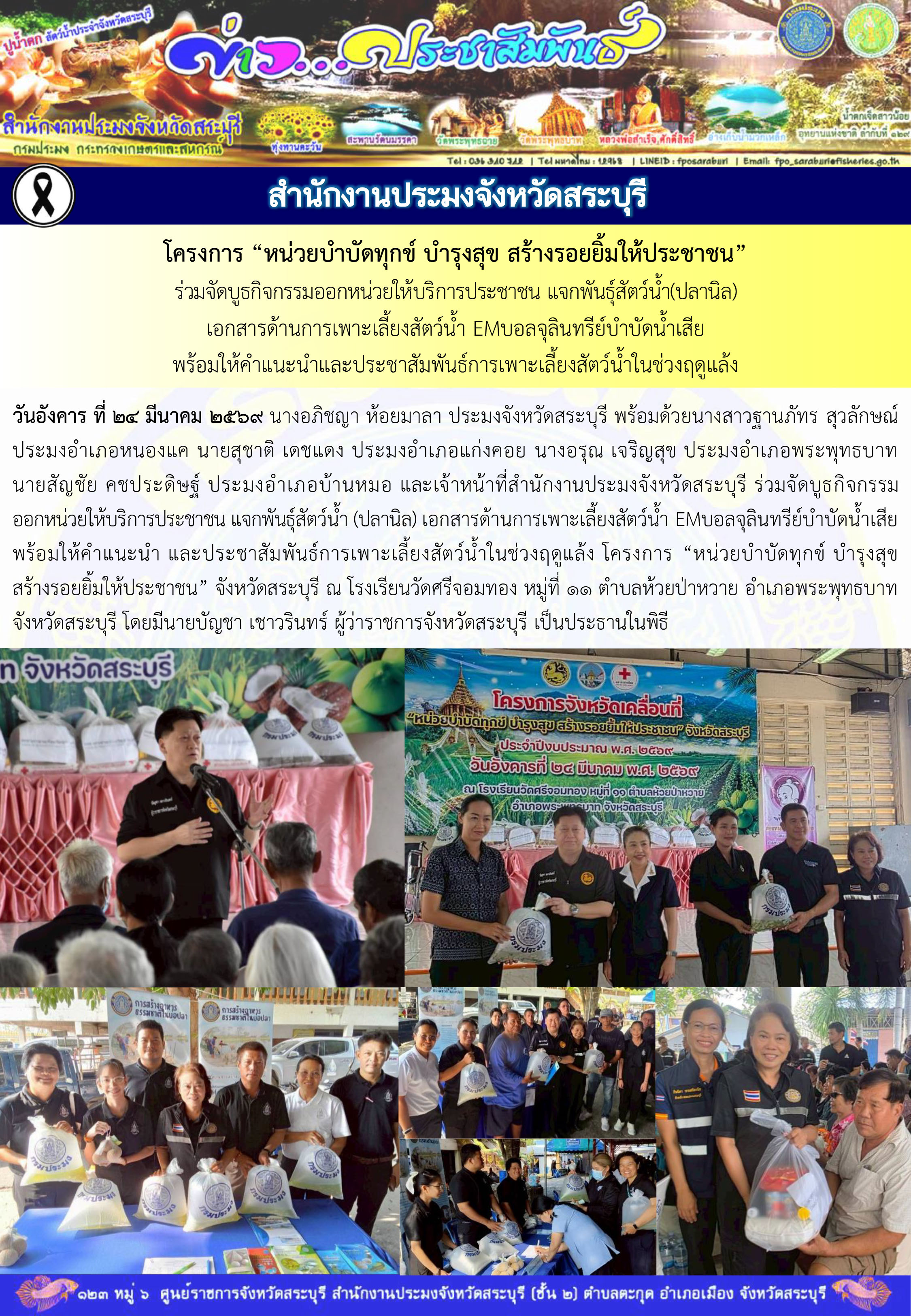วันอังคาร ที่ 24 มีนาคม 2569 นางอภิชญา ห้อยมาลา ประมงจังหวัดสระบุรี พร้อมด้วยนางสาวฐานภัทร สุวลักษณ์ ประมงอำเภอหนองแค นายสุชาติ เดชแดง ประมงอำเภอแก่งคอย นางอรุณ เจริญสุข ประมงอำเภอพระพุทธบาท นายสัญชัย คชประดิษฐ์ ประมงอำเภอบ้านหมอ และเจ้าหน้าที่สำนักงานประมงจังหวัดสระบุรี ร่วมจัดบูธกิจกรรมออกหน่วยให้บริการประชาชน แจกพันธุ์สัตว์น้ำ (ปลานิล) เอกสารด้านการเพาะเลี้ยงสัตว์น้ำ EMบอลจุลินทรีย์บำบัดน้ำเสีย พร้อมให้คำแนะนำ และประชาสัมพันธ์การเพาะเลี้ยงสัตว์น้ำในช่วงฤดูแล้ง โครงการ “หน่วยบำบัดทุกข์ บำรุงสุข สร้างรอยยิ้มให้ประชาชน” จังหวัดสระบุรี ณ โรงเรียนวัดศรีจอมทอง หมู่ที่ 11 ตำบลห้วยป่าหวาย อำเภอพระพุทธบาท จังหวัดสระบุรี โดยมีนายบัญชา เชาวรินทร์ ผู้ว่าราชการจังหวัดสระบุรี เป็นประธานในพิธี