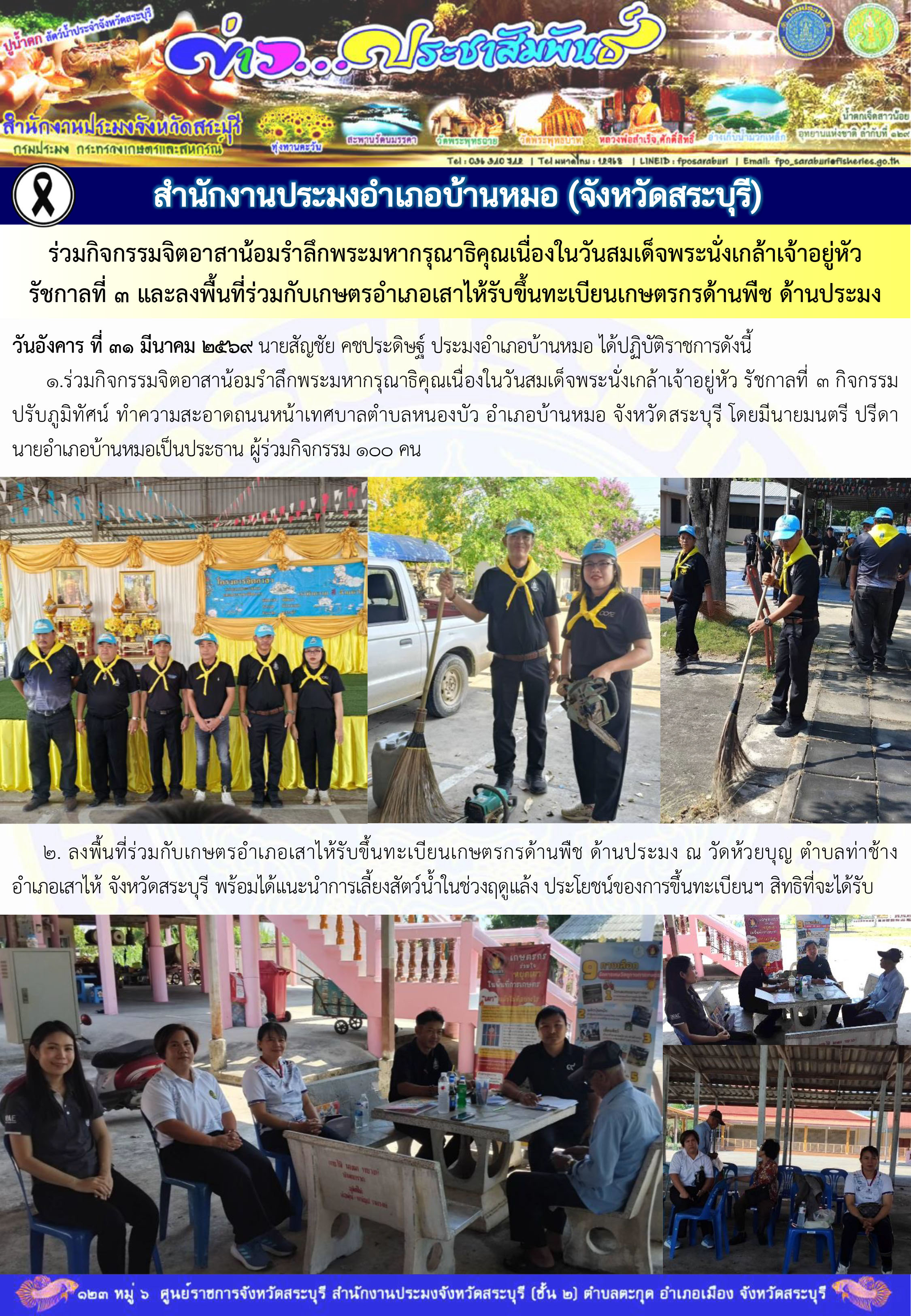 สำนักงานประมงอำเภอบ้านหมอ ร่วมกิจกรรมจิตอาสาน้อมรำลึกพระมหากรุณาธิคุณเนื่องในวันสมเด็จพระนั่งเกล้าเจ้าอยู่หัว รัชกาลที่ 3 และลงพื้นที่ร่วมกับเกษตรอำเภอเสาไห้รับขึ้นทะเบียนเกษตรกรด้านพืช ด้านประมง